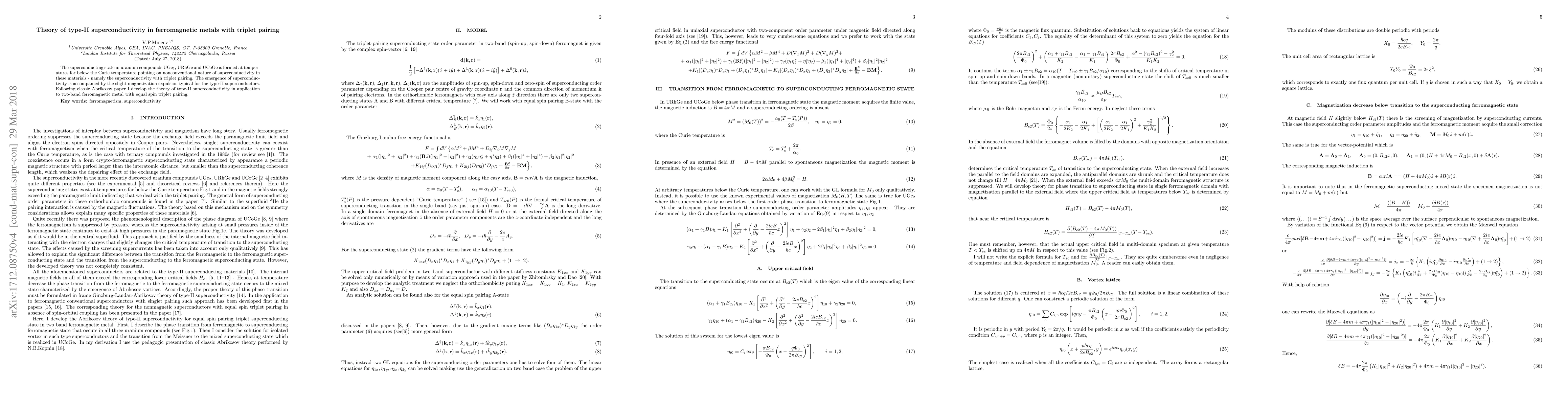 This paper develops a theory for type-II superconductivity in ferromagnetic metals with triplet pairing, explaining the unconventional superconductivity observed in uranium compounds like UGe2, URhGe, and UCoGe, which exhibit slight magnetization expulsion akin to type-II superconductors. The theory extends classic Abrikosov's work to two-band systems with equal spin triplet pairing.