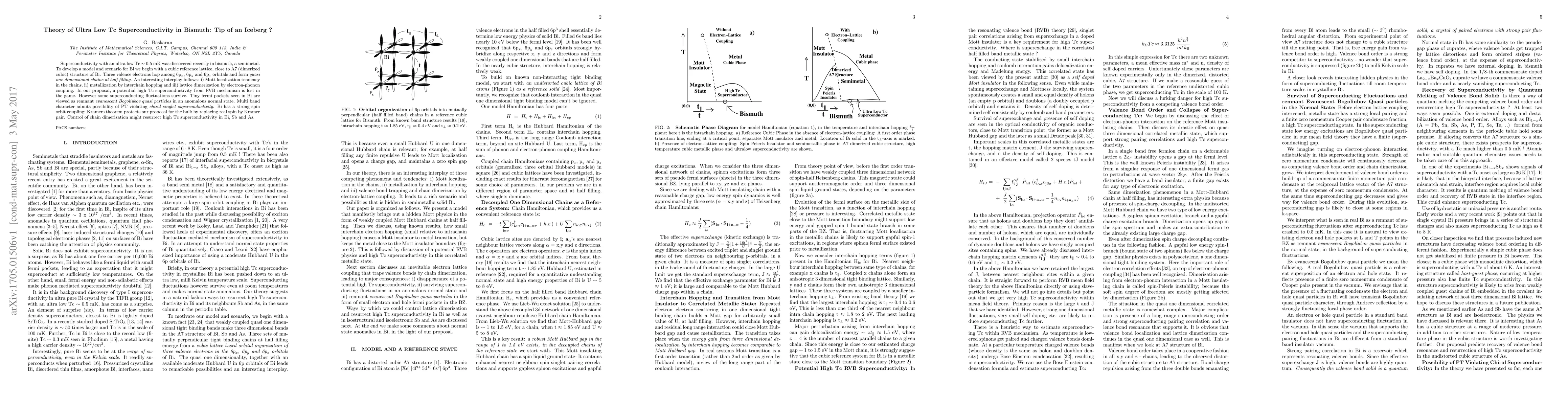 Superconductivity with an ultra low Tc $\sim$ 0.5 mK was discovered recently in bismuth, a semimetal. To develop a model and scenario for Bi we begin with a cubic reference lattice, close to A7 (dimerized cubic) structure of Bi. Three valence electrons hop among 6p$_x$, 6p$_y$ and 6p$_z$ orbitals and form \textit{quasi one dimensional chains at half filling}. An interesting interplay follows: i) Mott localization tendency in the chains, ii) metallization by interchain hopping and iii) lattice dimerization by electron-phonon coupling. In our proposal, a potential high Tc superconductivity from RVB mechanism is lost in the game. However some superconducting fluctuations survive. Tiny fermi pockets seen in Bi are viewed as remnant \textit{evanescent Bogoliubov quasi particles} in an anomalous normal state. Multi band character admits possibility of PT violating \textit{chiral singlet superconductivity}. Bi has a strong spin orbit coupling; Kramers theorem protects our proposal for the bulk by replacing real spin by Kramer pair. Control of chain dimerization might resurrect high Tc superconductivity in Bi, Sb and As.