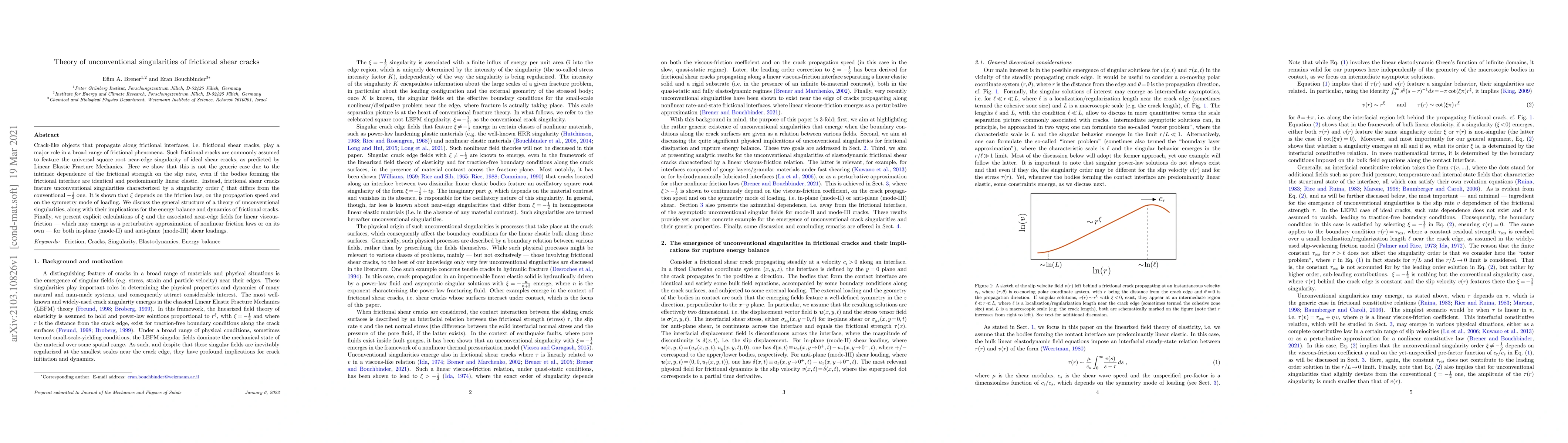 This paper proposes a theory for the unconventional singularities of frictional shear cracks, demonstrating that they deviate from the standard square root singularity due to frictional strength dependence on slip rate. It explores how the singularity order $\xi$ varies based on friction law, crack propagation speed, and loading mode, and presents calculations for linear viscous-friction scenarios in both mode-II and mode-III shear loadings.