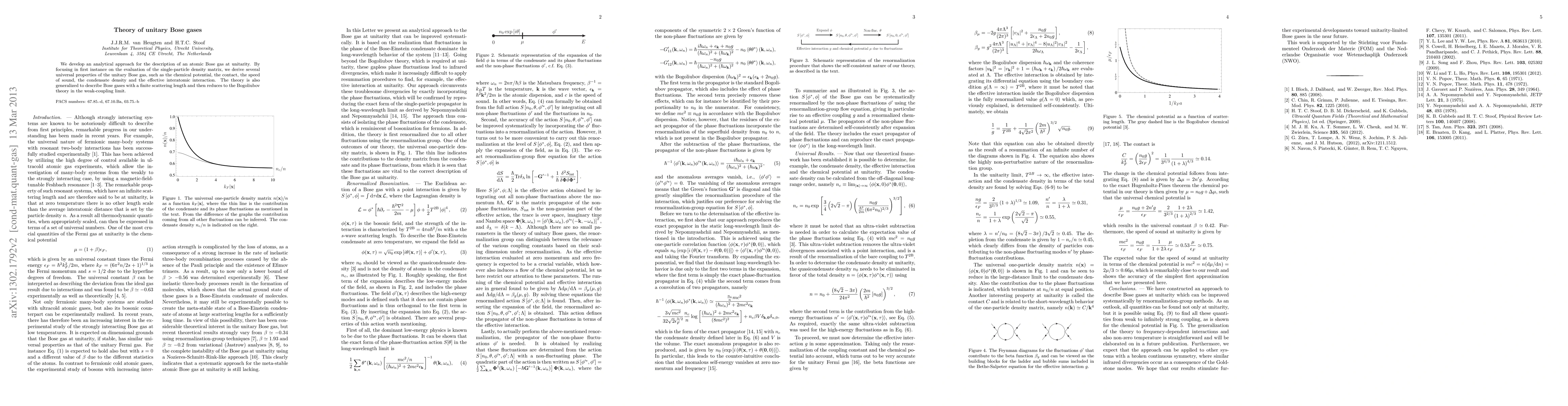 This paper presents an analytical framework for understanding unitary Bose gases, deriving key properties like chemical potential, contact, and sound speed, and generalizes to finite scattering length scenarios, reducing to Bogoliubov theory in the weak-coupling limit.