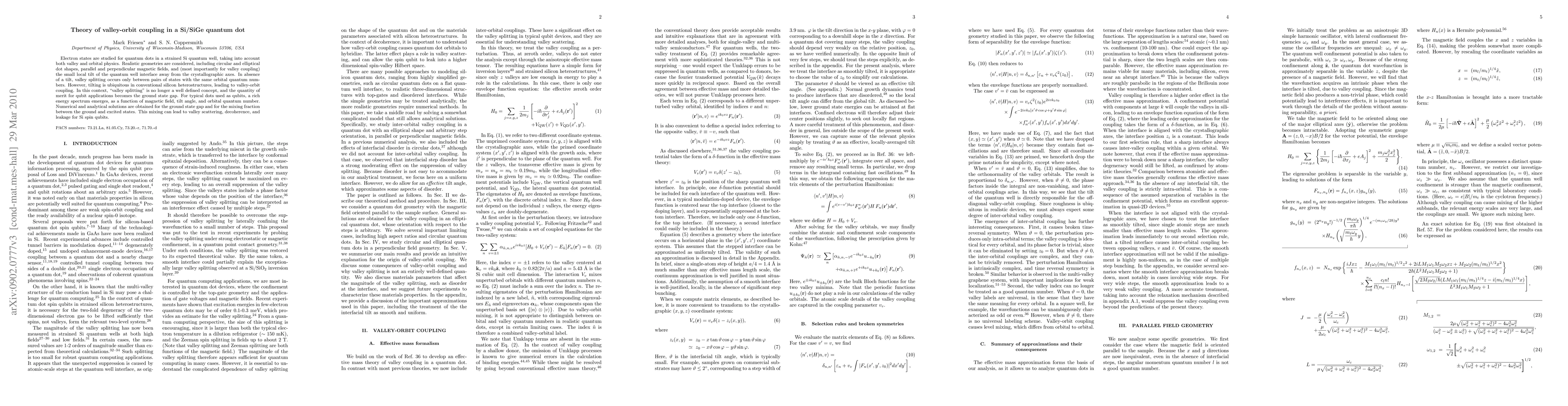 Electron states are studied for quantum dots in a strained Si quantum well, taking into account both valley and orbital physics. Realistic geometries are considered, including circular and elliptical dot shapes, parallel and perpendicular magnetic fields, and (most importantly for valley coupling) the small local tilt of the quantum well interface away from the crystallographic axes. In absence of a tilt, valley splitting occurs only between pairs of states with the same orbital quantum numbers. However, tilting is ubiquitous in conventional silicon heterostructures, leading to valley-orbit coupling. In this context, "valley splitting" is no longer a well defined concept, and the quantity of merit for qubit applications becomes the ground state gap. For typical dots used as qubits, a rich energy spectrum emerges, as a function of magnetic field, tilt angle, and orbital quantum number. Numerical and analytical solutions are obtained for the ground state gap and for the mixing fraction between the ground and excited states. This mixing can lead to valley scattering, decoherence, and leakage for Si spin qubits.