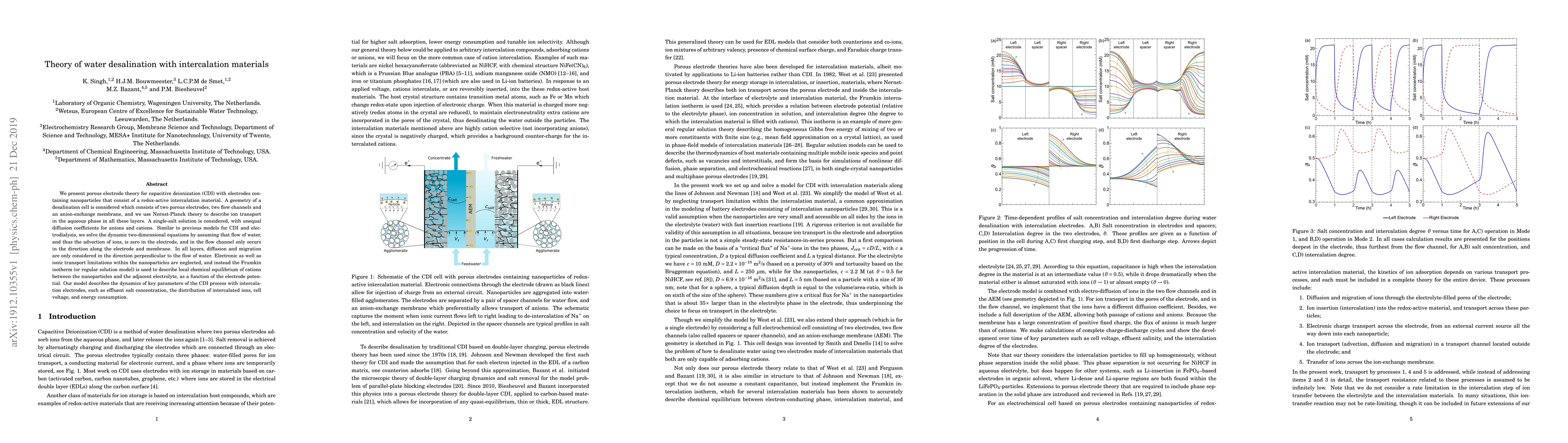 We present porous electrode theory for capacitive deionization (CDI) with electrodes containing nanoparticles that consist of a redox-active intercalation material. A geometry of a desalination cell is considered which consists of two porous electrodes, two flow channels and an anion-exchange membrane, and we use Nernst-Planck theory to describe ion transport in the aqueous phase in all these layers. A single-salt solution is considered, with unequal diffusion coefficients for anions and cations. Similar to previous models for CDI and electrodialysis, we solve the dynamic two-dimensional equations by assuming that flow of water, and thus the advection of ions, is zero in the electrode, and in the flow channel only occurs in the direction along the electrode and membrane. In all layers, diffusion and migration are only considered in the direction perpendicular to the flow of water. Electronic as well as ionic transport limitations within the nanoparticles are neglected, and instead the Frumkin isotherm (or regular solution model) is used to describe local chemical equilibrium of cations between the nanoparticles and the adjacent electrolyte, as a function of the electrode potential. Our model describes the dynamics of key parameters of the CDI process with intercalation electrodes, such as effluent salt concentration, the distribution of intercalated ions, cell voltage, and energy consumption.