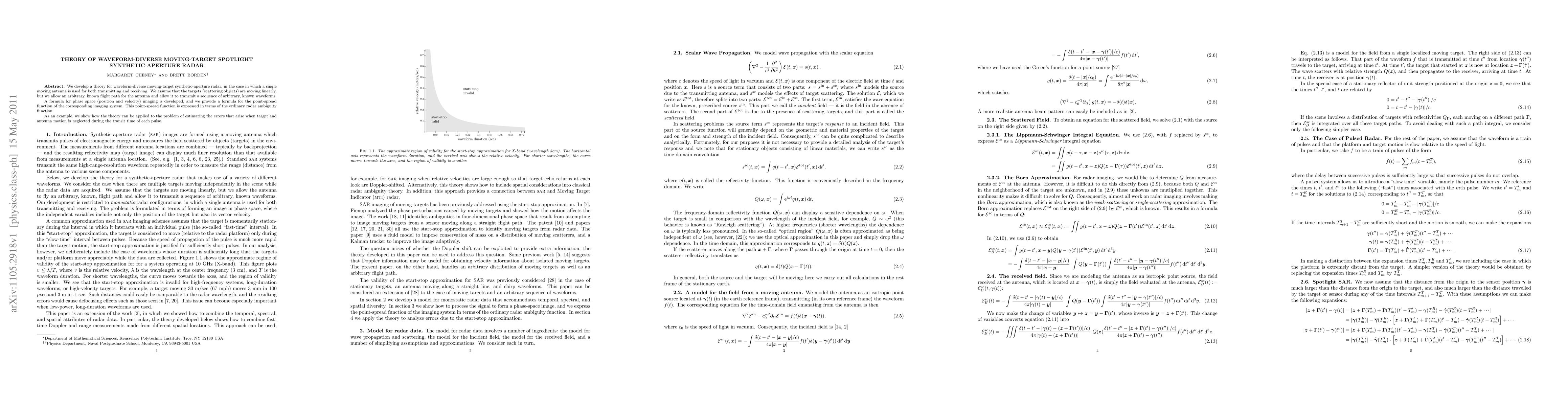 This paper develops a theoretical framework for waveform-diverse moving-target synthetic-aperture radar using a single antenna for both transmission and reception. It provides a formula for phase space imaging and a point-spread function expressed in terms of the radar ambiguity function, demonstrating its application in estimating errors from neglecting target and antenna motion.