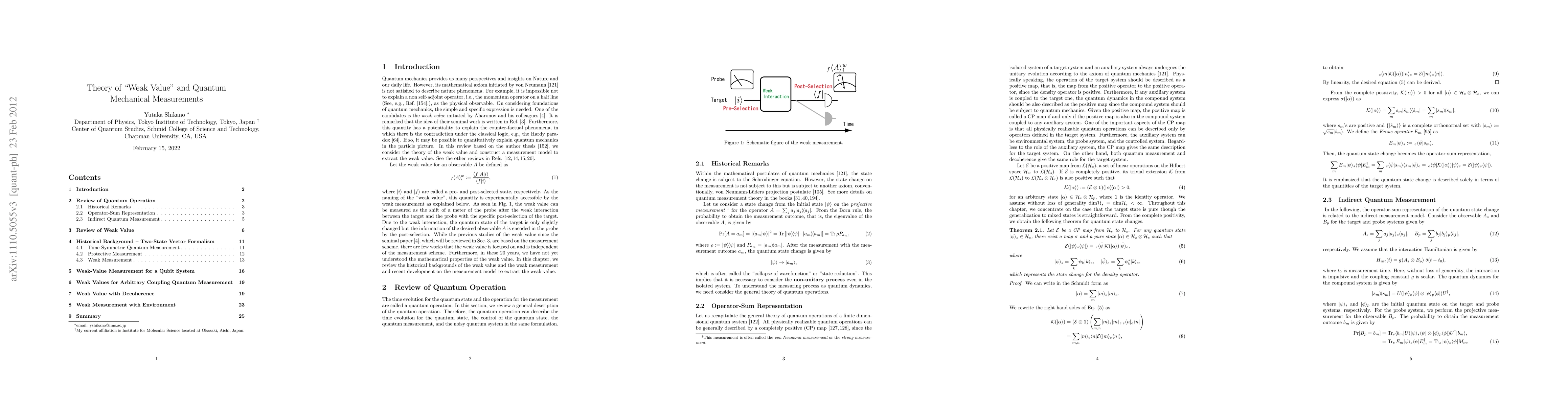 We review the definition and the concepts of the weak values and some measurement model to extract the weak value. This material is based on the author Ph.D. thesis "Time in Weak Values and Discrete Time Quantum Walk" at Tokyo Institute of Technology (2011).
