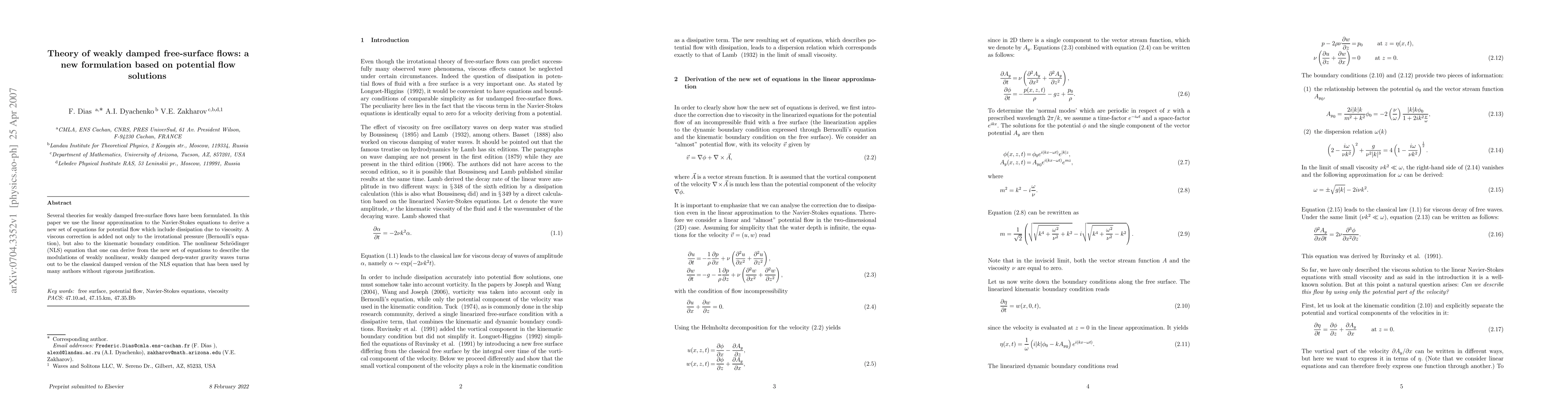 Researchers derived a new set of equations for potential flow with dissipation due to viscosity in weakly damped free-surface flows, leading to a nonlinear Schrödinger equation that describes deep-water gravity waves.