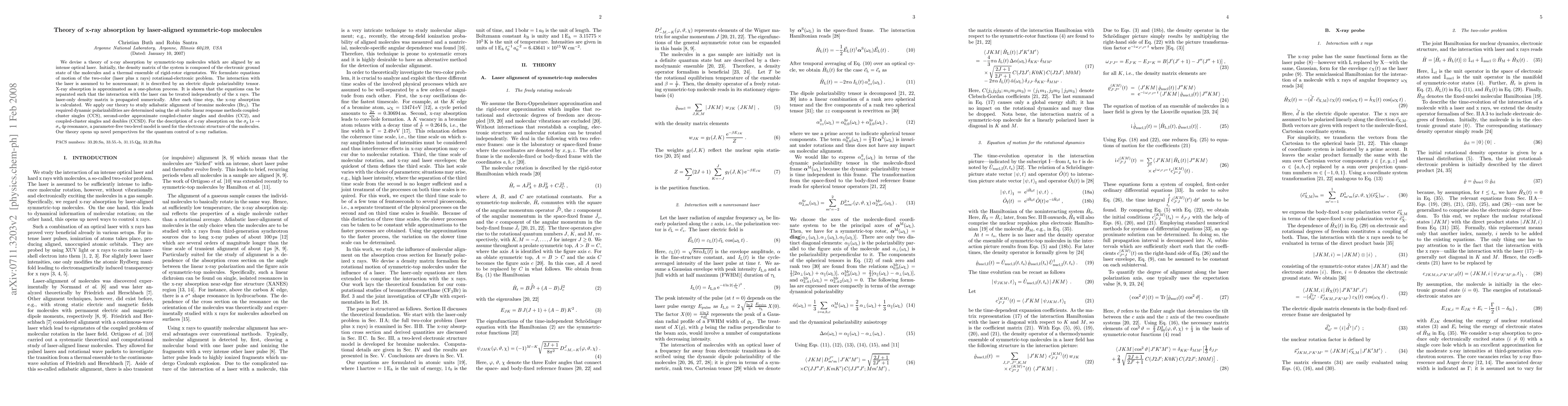 We devise a theory of x-ray absorption by symmetric-top molecules which are aligned by an intense optical laser. Initially, the density matrix of the system is composed of the electronic ground state of the molecules and a thermal ensemble of rigid-rotor eigenstates. We formulate equations of motion of the two-color (laser plus x rays) rotational-electronic problem. The interaction with the laser is assumed to be nonresonant; it is described by an electric dipole polarizability tensor. X-ray absorption is approximated as a one-photon process. It is shown that the equations can be separated such that the interaction with the laser can be treated independently of the x rays. The laser-only density matrix is propagated numerically. After each time step, the x-ray absorption is calculated. We apply our theory to study adiabatic alignment of bromine molecules (Br2). The required dynamic polarizabilities are determined using the ab initio linear response methods coupled-cluster singles (CCS), second-order approximate coupled-cluster singles and doubles (CC2), and coupled-cluster singles and doubles (CCSD). For the description of x-ray absorption on the sigma_g 1s --> sigma_u 4p resonance, a parameter-free two-level model is used for the electronic structure of the molecules. Our theory opens up novel perspectives for the quantum control of x-ray radiation.