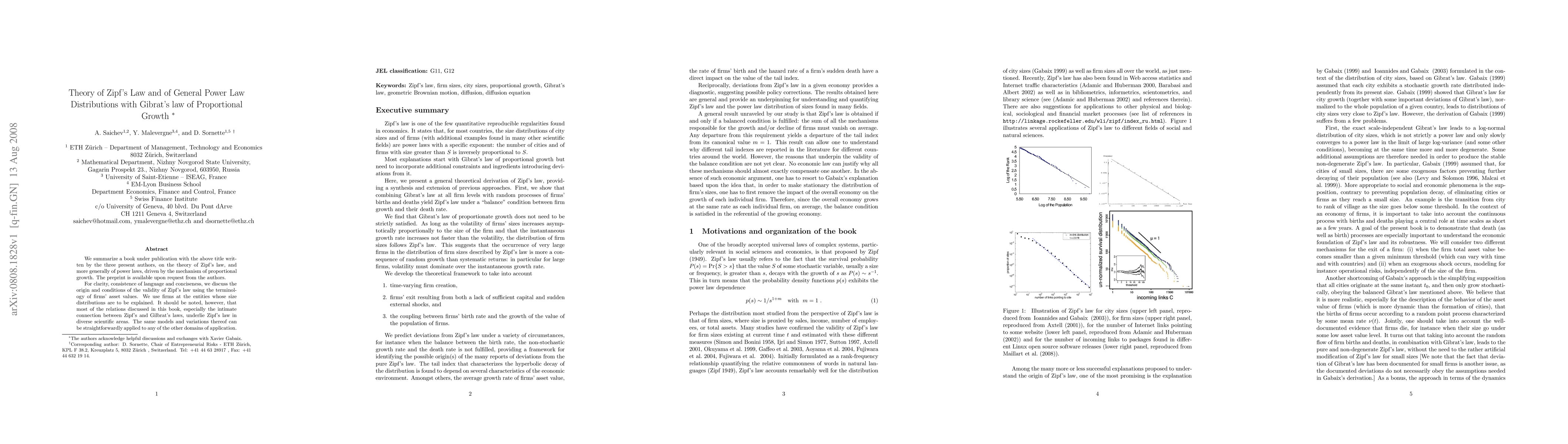 We summarize a book under publication with his title written by the three present authors, on the theory of Zipf's law, and more generally of power laws, driven by the mechanism of proportional growth. The preprint is available upon request from the authors. For clarity, consistence of language and conciseness, we discuss the origin and conditions of the validity of Zipf's law using the terminology of firms' asset values. We use firms at the entities whose size distributions are to be explained. It should be noted, however, that most of the relations discussed in this book, especially the intimate connection between Zipf's and Gilbrat's laws, underlie Zipf's law in diverse scientific areas. The same models and variations thereof can be straightforwardly applied to any of the other domains of application.