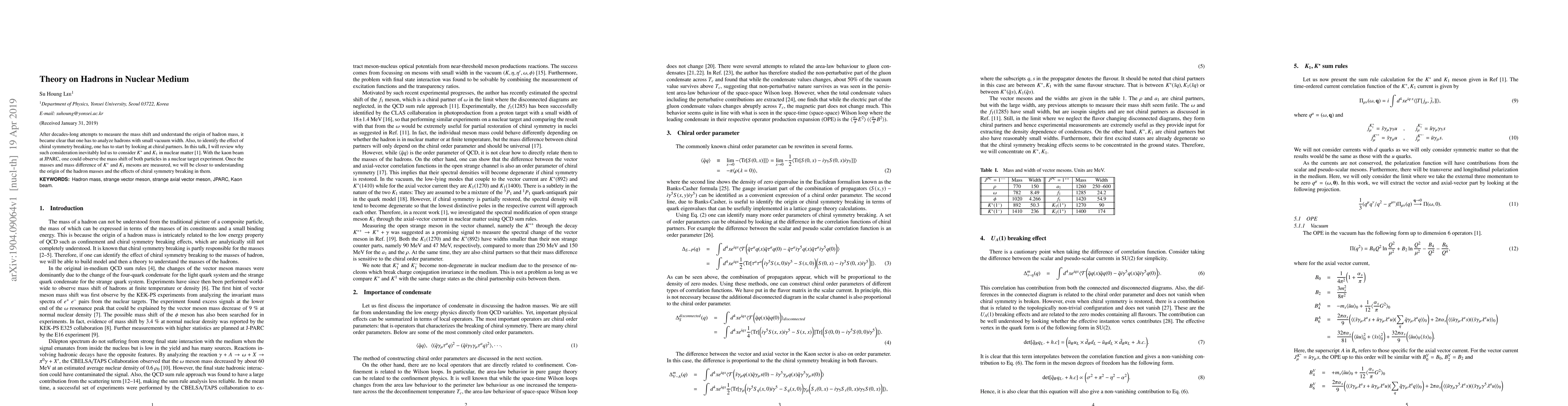 After decades-long attempts to measure the mass shift and understand the origin of hadron mass, it became clear that one has to analyze hadrons with small vacuum width. Also, to identify the effect of chiral symmetry breaking, one has to start by looking at chiral partners. In this talk, I will review why such consideration inevitably led us to consider $K^*$ and $K_1$ in nuclear matter [T. Song, T. Hatsuda, S H Lee, PLB792 (2019) 160-169]. With the kaon beam at JPARC, one could observe the mass shift of both particles in a nuclear target experiment. Once the masses and mass difference of $K^*$ and $K_1$ mesons are measured, we will be closer to understanding the origin of the hadron masses and the effects of chiral symmetry breaking in them.