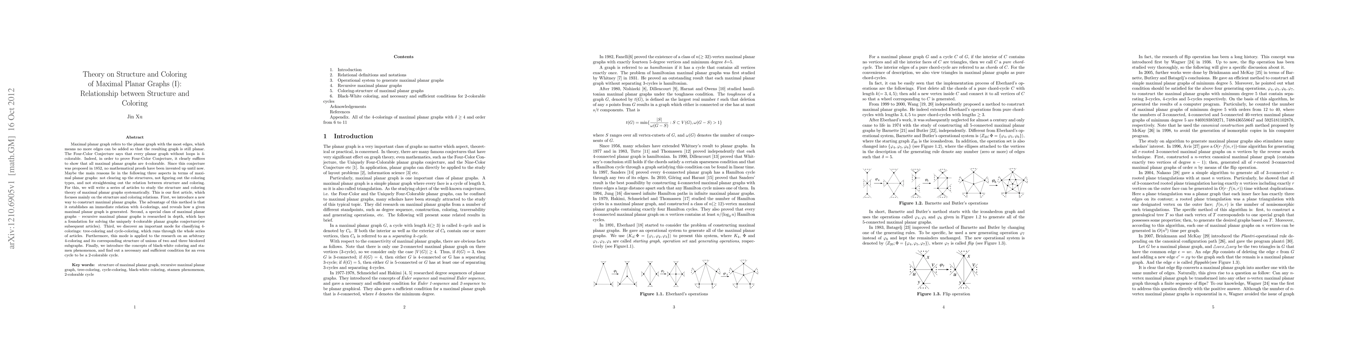 Maximal planar graph refers to the planar graph with the most edges, which means no more edges can be added so that the resulting graph is still planar. The Four-Color Conjecture says that every planar graph without loops is 4-colorable. Indeed, in order to prove Four-Color Conjecture, it clearly suffices to show that all maximal planar graphs are 4-colorable. Since this conjecture was proposed in 1852, no mathematical proofs have been invented up until now. Maybe the main reasons lie in the following three aspects in terms of maximal planar graphs: not clearing up the structures, not figuring out the coloring types, and not straightening out the relation between structure and coloring. For this, we will write a series of articles to study the structure and coloring theory of maximal planar graphs systematically. This is our first article, which focuses mainly on the structure and coloring relations. First, we introduce a new way to construct maximal planar graphs. The advantage of this method is that it establishes an immediate relation with 4-colorings, and reveals how a given maximal planar graph is generated. Second, a special class of maximal planar graphs--recursive maximal planar graphs is researched in depth, which lays a foundation for solving the uniquely 4-colorable planar graphs conjecture(see subsequent articles). Third, we discover an important mode for classifying 4-colorings: tree-coloring and cycle-coloring, which runs through the whole series of articles. Furthermore, this mode is applied to the research on an arbitrary 4-coloring and its corresponding structure of unions of two and three bicolored subgraphs. Finally, we introduce the concepts of black-white coloring and stamen phenomenon, and find out a necessary and sufficient condition for an even cycle to be a 2-colorable cycle.