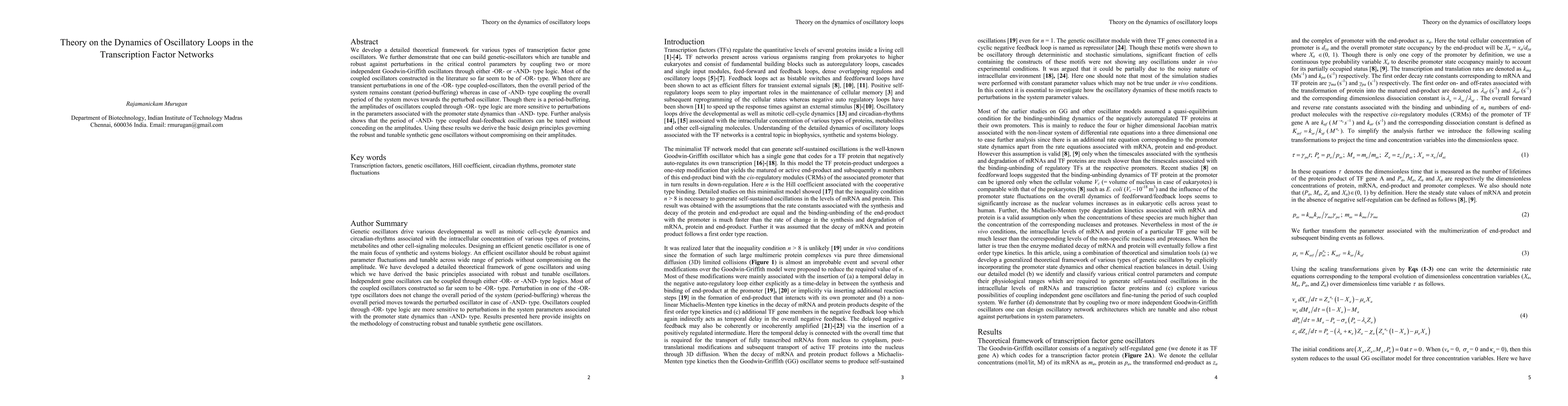 We develop a detailed theoretical framework for various types of transcription factor gene oscillators. We further demonstrate that one can build genetic-oscillators which are tunable and robust against perturbations in the critical control parameters by coupling two or more independent Goodwin-Griffith oscillators through either -OR- or -AND- type logic. Most of the coupled oscillators constructed in the literature so far seem to be of -OR- type. When there are transient perturbations in one of the -OR- type coupled-oscillators, then the overall period of the system remains constant (period-buffering) whereas in case of -AND- type coupling the overall period of the system moves towards the perturbed oscillator. Though there is a period-buffering, the amplitudes of oscillators coupled through -OR- type logic are more sensitive to perturbations in the parameters associated with the promoter state dynamics than -AND- type. Further analysis shows that the period of -AND- type coupled dual-feedback oscillators can be tuned without conceding on the amplitudes. Using these results we derive the basic design principles governing the robust and tunable synthetic gene oscillators without compromising on their amplitudes.
