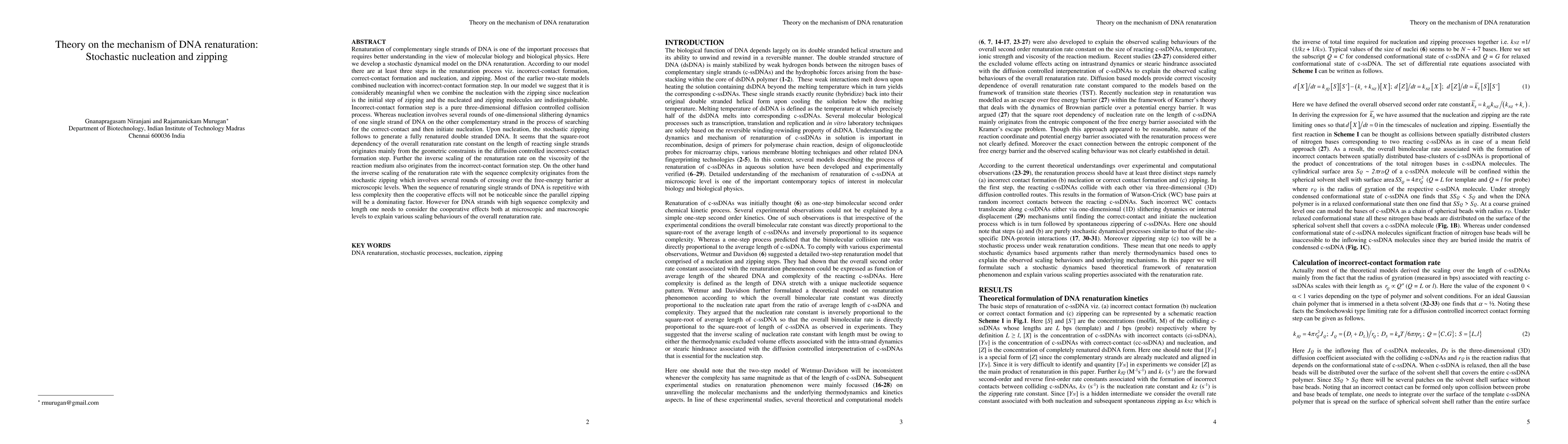 This paper proposes a stochastic dynamical model for DNA renaturation, distinguishing incorrect-contact formation, correct-contact formation, nucleation, and zipping as separate steps. It emphasizes that nucleation should be combined with zipping due to their indistinguishable nature, and highlights the geometric constraints and free-energy barriers affecting the renaturation process.