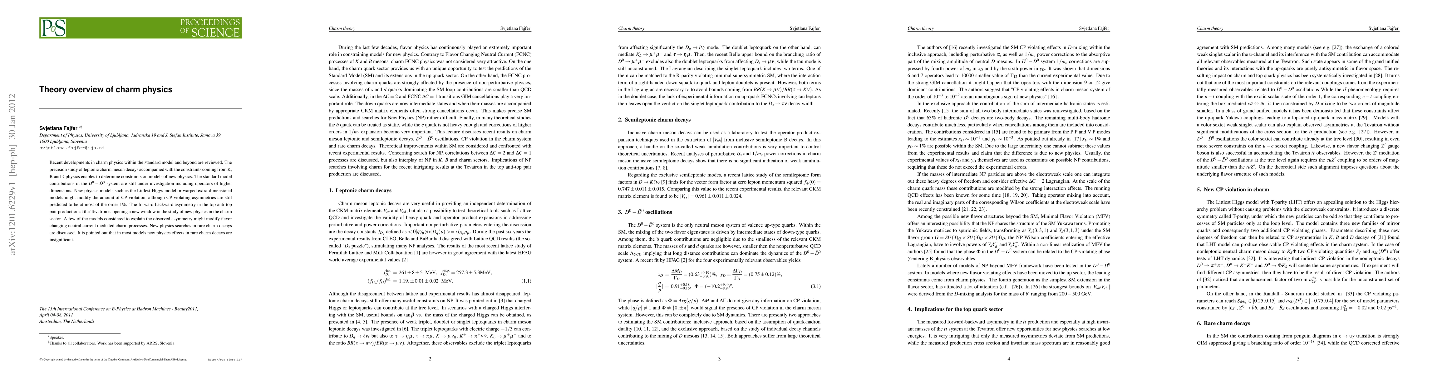 This paper reviews recent developments in charm physics, focusing on the precision study of leptonic charm meson decays and their implications for new physics models. It highlights the potential of forward-backward asymmetry in top anti-top pair production to reveal new physics, while noting that new effects in rare charm decays are generally insignificant.