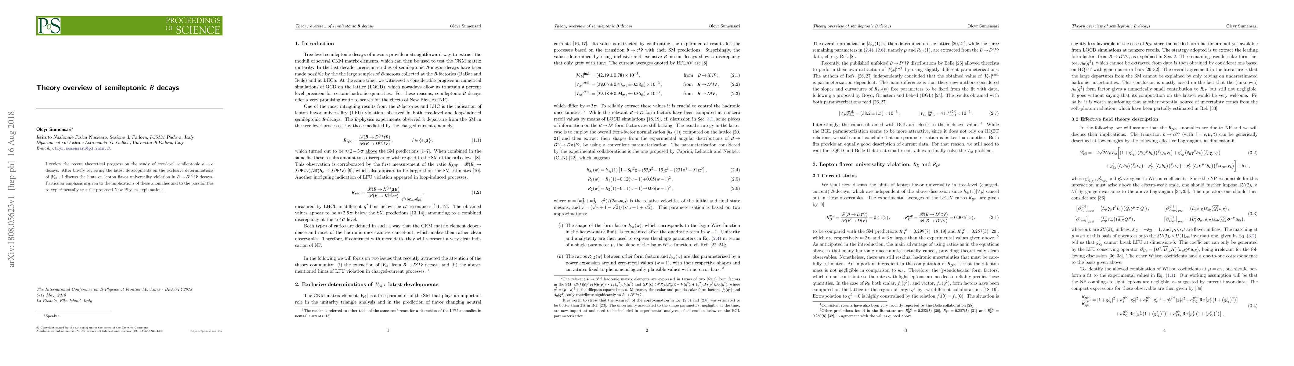 I review the recent theoretical progress on the study of tree-level semileptonic $b\to c$ decays. After briefly reviewing the latest developments on the exclusive determinations of $|V_{cb}|$, I discuss the hints on lepton flavor universality violation in $B\to D^{(\ast)}\ell \bar{\nu}$ decays. Particular emphasis is given to the implications of these anomalies and to the possibilities to experimentally test the proposed New Physics explanations.
