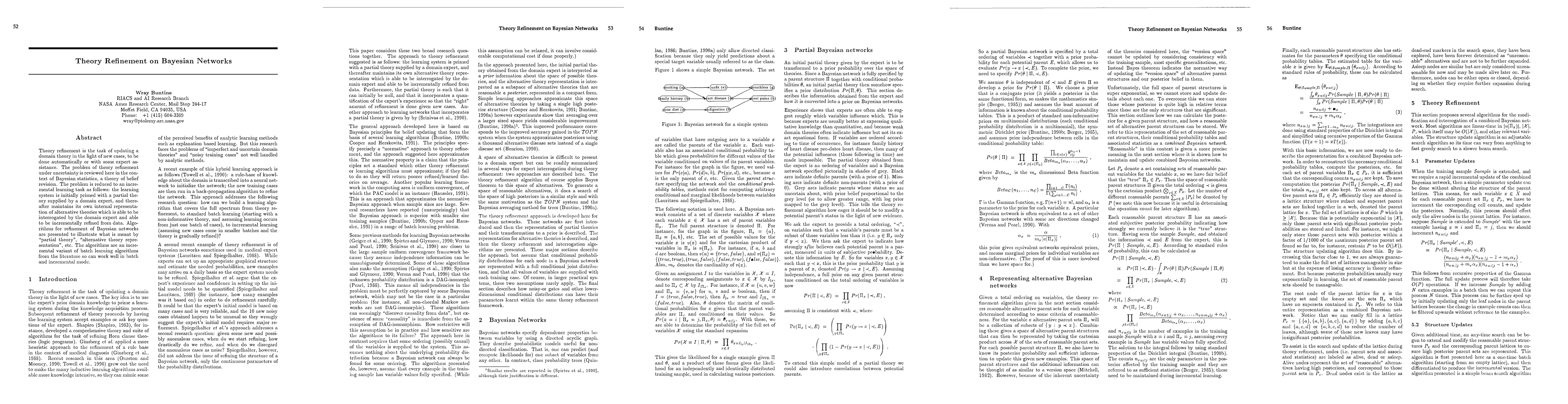 This paper discusses theory refinement in Bayesian networks, presenting algorithms for incremental learning. It explains how to update domain theories with new cases, using Bayesian statistics for belief revision. The approach involves initial priming with a partial theory from an expert, maintaining alternative theory representations, and refining from data, applicable both in batch and incremental modes.