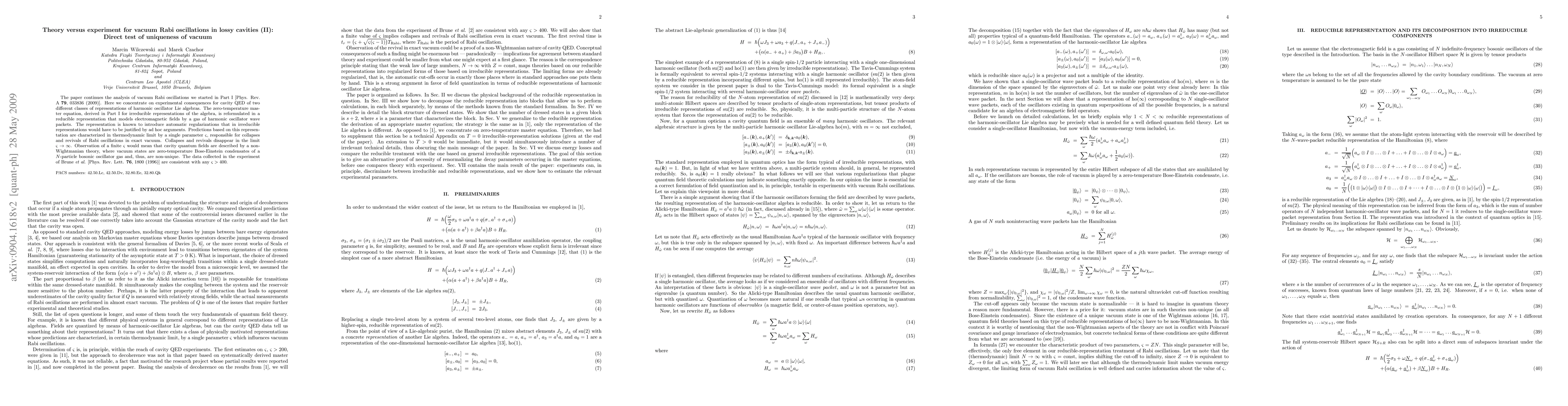 The paper continues the analysis of vacuum Rabi oscillations we started in Part I [Phys. Rev. A {\bf 79}, 033836 (2009)]. Here we concentrate on experimental consequences for cavity QED of two different classes of representations of harmonic oscillator Lie algebras. The zero-temperature master equation, derived in Part I for irreducible representations of the algebra, is reformulated in a reducible representation that models electromagnetic fields by a gas of harmonic oscillator wave packets. The representation is known to introduce automatic regularizations that in irreducible representations would have to be justified by ad hoc arguments. Predictions based on this representation are characterized in thermodynamic limit by a single parameter $\varsigma$, responsible for collapses and revivals of Rabi oscillations in exact vacuum. Collapses and revivals disappear in the limit $\varsigma\to\infty$. Observation of a finite $\varsigma$ would mean that cavity quantum fields are described by a non-Wightmanian theory, where vacuum states are zero-temperature Bose-Einstein condensates of a finite-particle bosonic oscillator gas and, thus, are non-unique. The data collected in the experiment of Brune {\it et al.} [Phys. Rev. Lett. {\bf{76}}, 1800 (1996)] are consistent with any $\varsigma>400$.