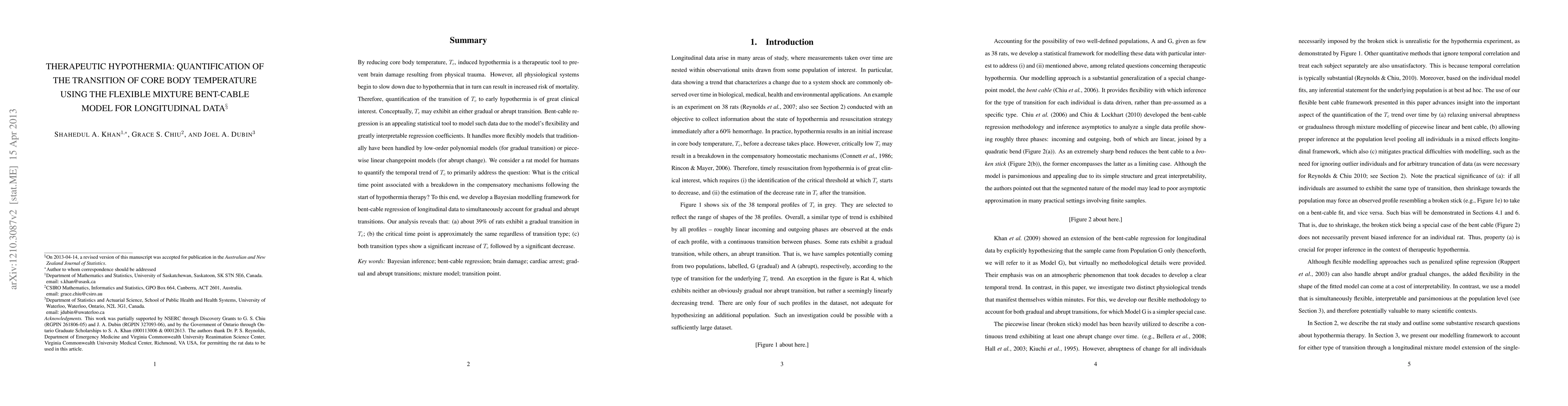 By reducing core body temperature, T_c, induced hypothermia is a therapeutic tool to prevent brain damage resulting from physical trauma. However, all physiological systems begin to slow down due to hypothermia that in turn can result in increased risk of mortality. Therefore, quantification of the transition of T_c to early hypothermia is of great clinical interest. Conceptually, T_c may exhibit an either gradual or abrupt transition. Bent-cable regression is an appealing statistical tool to model such data due to the model's flexibility and greatly interpretable regression coefficients. It handles more flexibly models that traditionally have been handled by low-order polynomial models (for gradual transition) or piecewise linear changepoint models (for abrupt change). We consider a rat model for humans to quantify the temporal trend of T_c to primarily address the question: What is the critical time point associated with a breakdown in the compensatory mechanisms following the start of hypothermia therapy? To this end, we develop a Bayesian modelling framework for bent-cable regression of longitudinal data to simultaneously account for gradual and abrupt transitions. Our analysis reveals that: (a) about 39% of rats exhibit a gradual transition in T_c; (b) the critical time point is approximately the same regardless of transition type; (c) both transition types show a significant increase of T_c followed by a significant decrease.