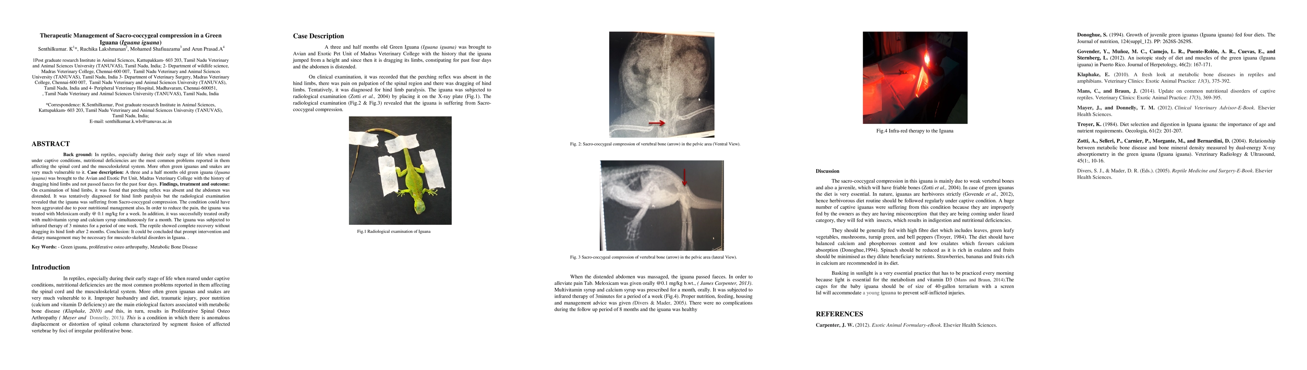 In reptiles, especially during their early stage of life when reared under captive conditions, nutritional deficiencies are the most common problems reported in them affecting the spinal cord and the musculoskeletal system. More often green iguanas and snakes are very much vulnerable to it. Case description: A three and a half months old green iguana (Iguana iguana) was brought to the Avian and Exotic Pet Unit, Madras Veterinary College with the history of dragging hind limbs and not passed faeces for the past four days. Findings, treatment and outcome: On examination of hind limbs, it was found that perching reflex was absent and the abdomen was distended. It was tentatively diagnosed for hind limb paralysis but the radiological examination revealed that the iguana was suffering from Sacro-coccygeal compression. The condition could have been aggravated due to poor nutritional management also. In order to reduce the pain, the iguana was treated with Meloxicam orally @ 0.1 mg/kg for a week. In addition, it was successfully treated orally with multivitamin syrup and calcium syrup simultaneously for a month. The iguana was subjected to infrared therapy of 3 minutes for a period of one week. The reptile showed complete recovery without dragging its hind limb after 2 months. Conclusion: It could be concluded that prompt intervention and dietary management may be necessary for musculo-skeletal disorders in Iguana. .