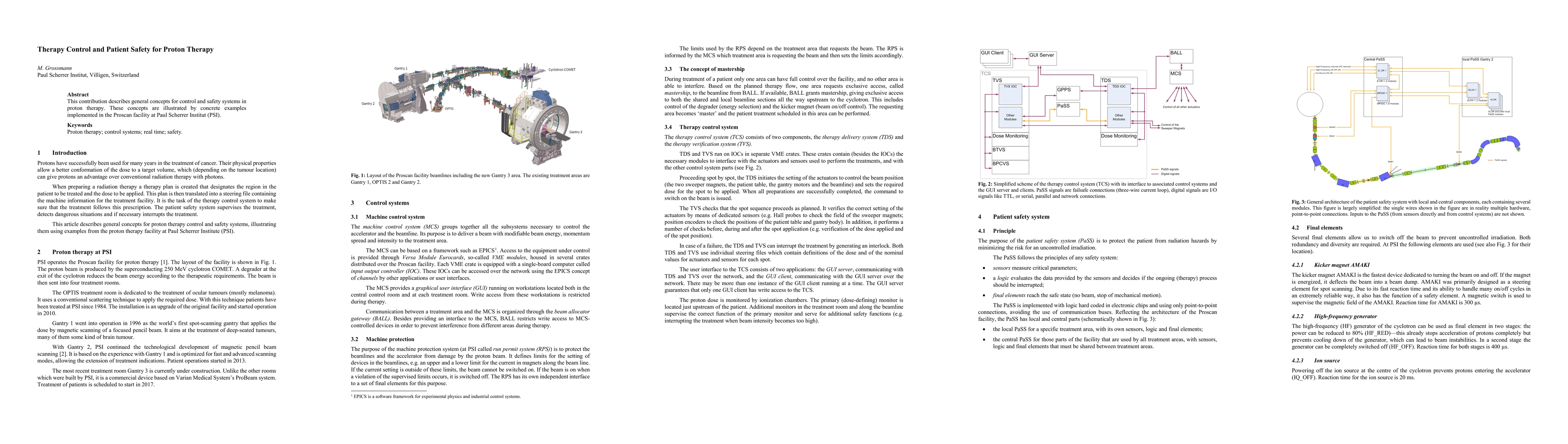 This paper discusses control and safety systems in proton therapy, highlighting key concepts and examples from the Proscan facility at PSI. It aims to improve patient safety through the development of effective monitoring and therapeutic control systems.