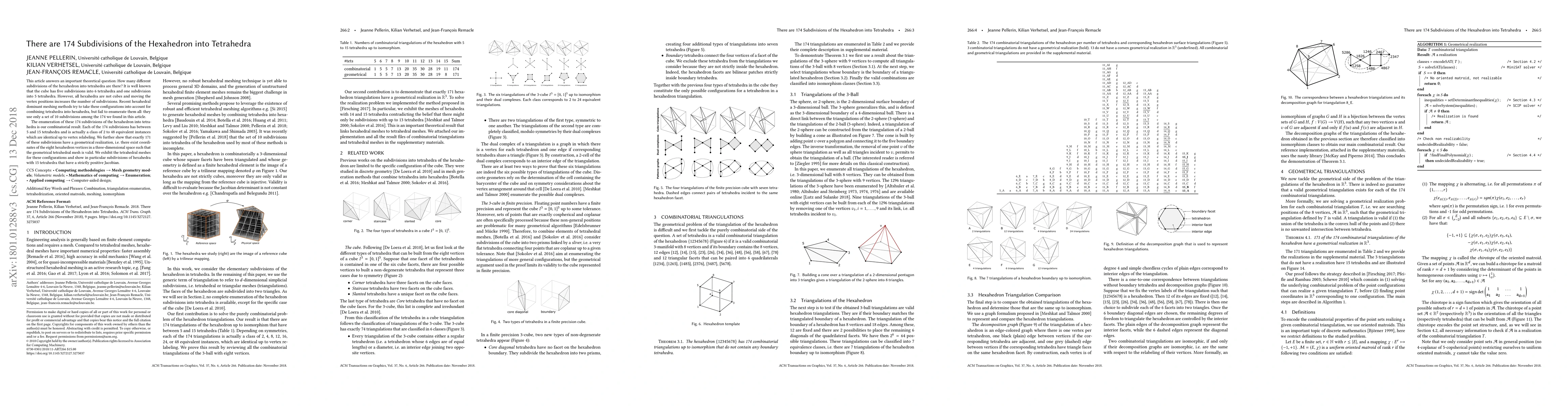 This paper enumerates 174 distinct subdivisions of the hexahedron into tetrahedra, revealing that only 10 of these were previously known. The study identifies that 171 of these subdivisions have geometrical realizations and provides examples of tetrahedral meshes for these configurations.