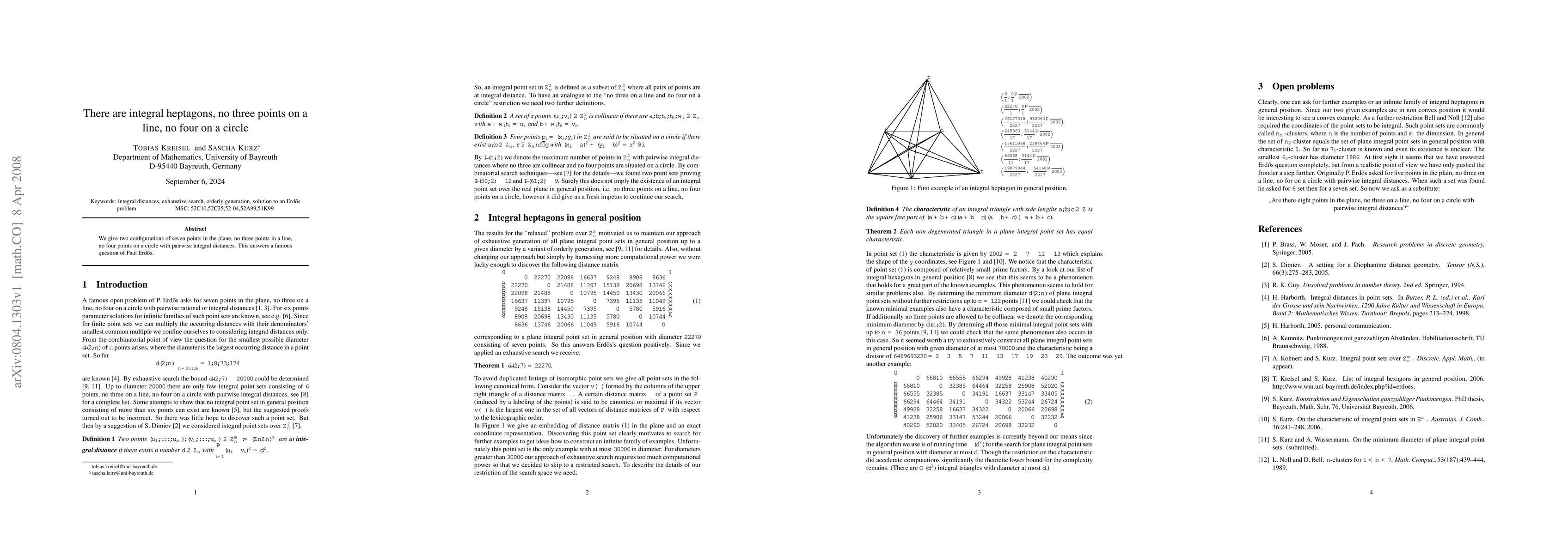 This paper presents two configurations of seven points in the plane, each with pairwise integral distances, ensuring no three points lie on a line and no four points are concyclic, thus resolving a longstanding question posed by Paul Erdős.