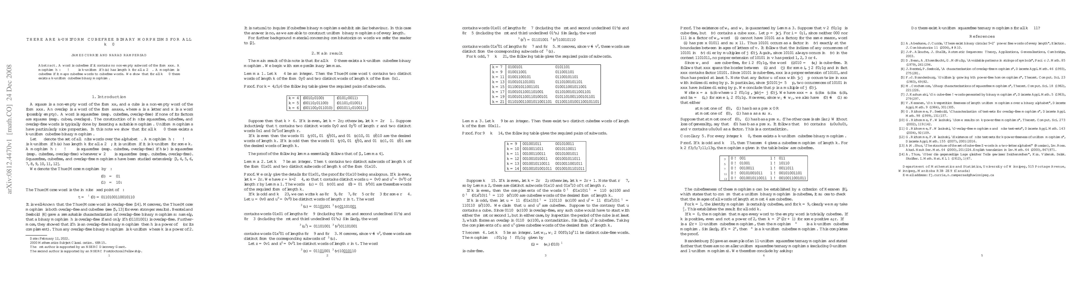 Summary: The paper proves the existence of k-uniform cubefree binary morphisms for any non-negative integer k, where a morphism maps cubefree words (words without "xxx" subwords) to other cubefree words, and is k-uniform if it transforms each input symbol into a string of length k.