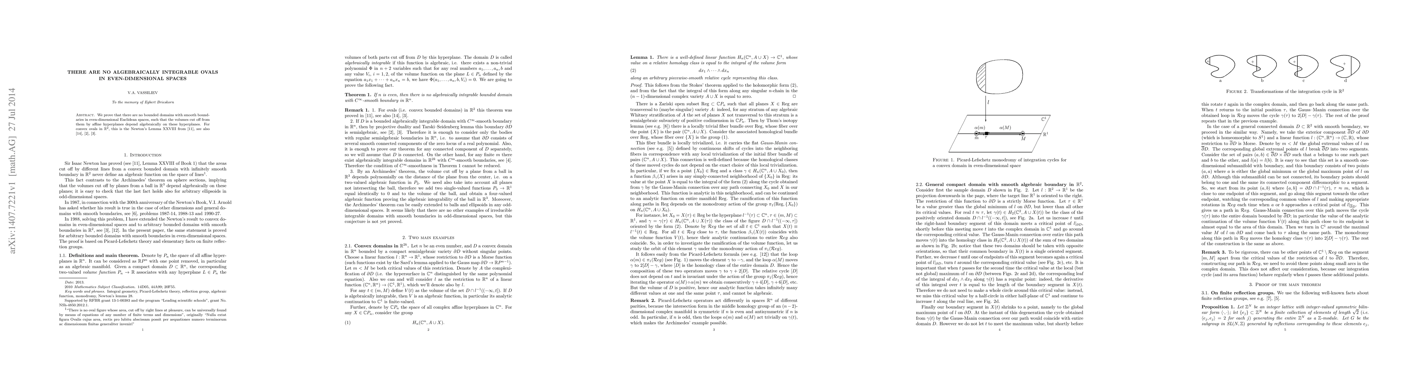 We prove that there are no bounded domains with smooth boundaries in even-dimensional Euclidean spaces, such that the volumes cut off from them by affine hyperplanes depend algebraically on these hyperplanes. For convex ovals in $R^2$, this is Lemma XXVIII from Newton's "Principia".