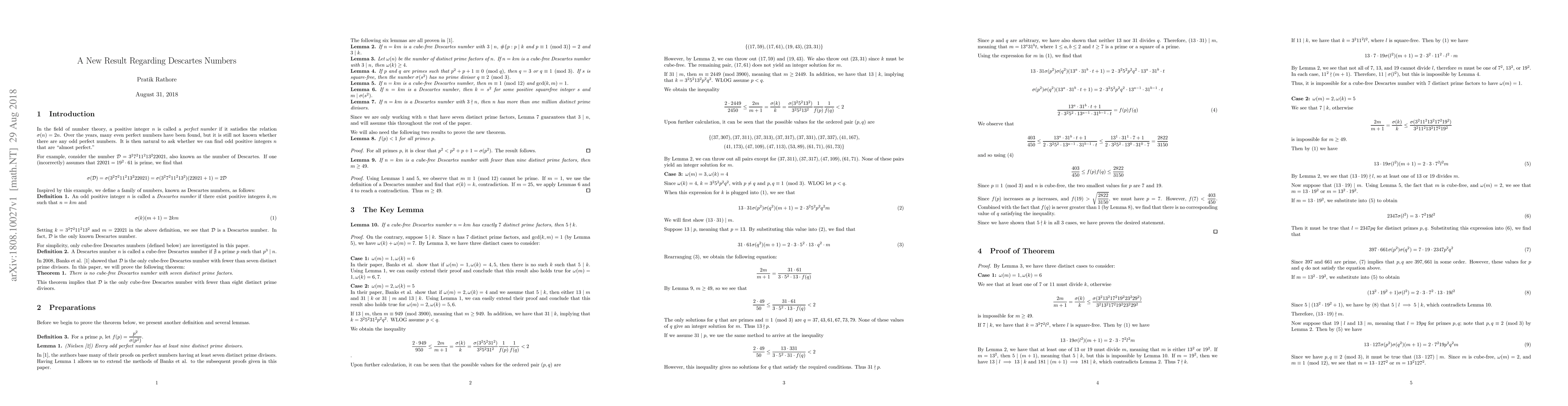 We call an odd positive integer $n$ a $\textit{Descartes number}$ if there exist positive integers $k,m$ such that $n = km$ and \begin{equation} \sigma(k)(m+1) = 2km \end{equation} Currently, $\mathcal{D} = 3^{2}7^{2}11^{2}13^{2}22021$ is the only known Descartes number. In $2008$, Banks et al. proved that $\mathcal{D}$ is the only cube-free Descartes number with fewer than seven distinct prime factors. In the present paper, we extend the methods of Banks et al. to show that there is no cube-free Descartes number with seven distinct prime factors.