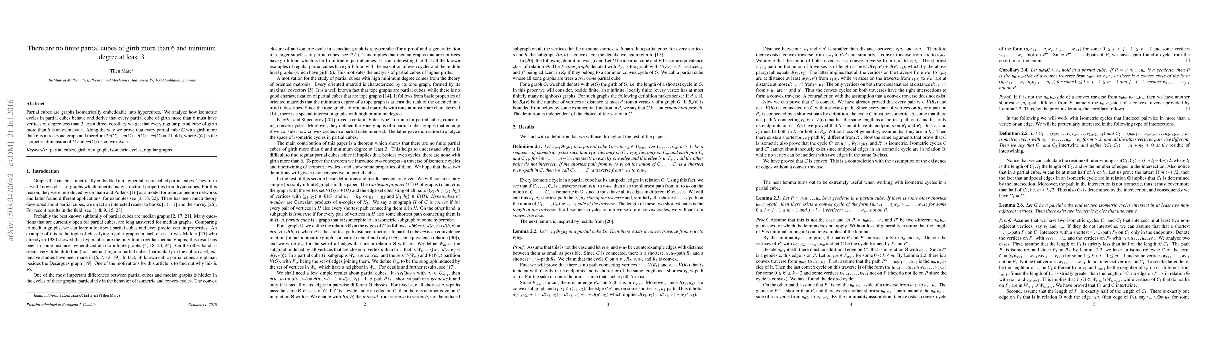 Partial cubes are graphs isometrically embeddable into hypercubes. We analyze how isometric cycles in partial cubes behave and derive that every partial cube of girth more than 6 must have vertices of degree less than 3. As a direct corollary we get that every regular partial cube of girth more than 6 is an even cycle. Along the way we prove that every partial cube $G$ with girth more than 6 is a tree-zone graph and therefore $2n(G)-m(G)-i(G)+ce(G)=2$ holds, where $i(G)$ is the isometric dimension of $G$ and $ce(G)$ its convex excess.