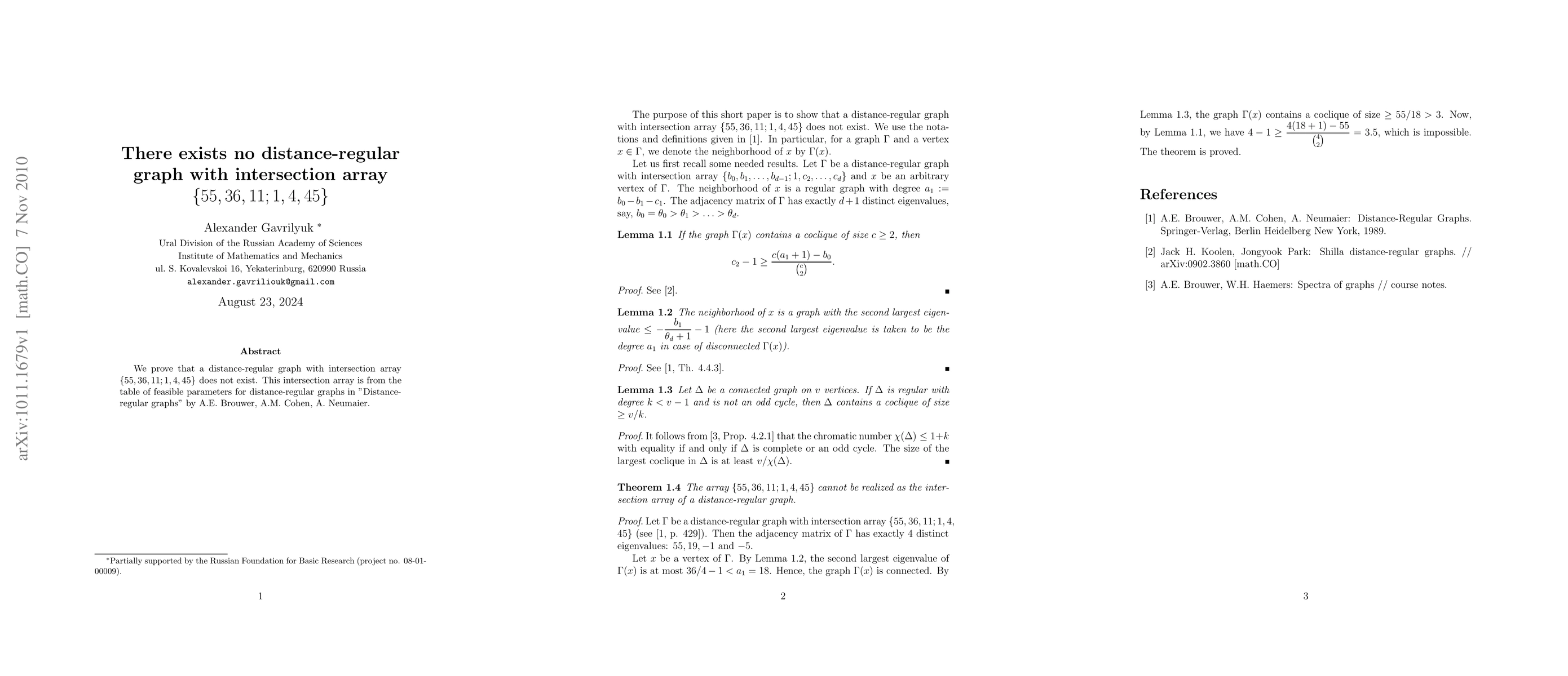This paper proves that a distance-regular graph with the specified intersection array $\{55,36,11;1,4,45\}$ cannot exist. The authors utilize properties from the comprehensive table of feasible parameters in Brouwer, Cohen, and Neumaier's "Distance-regular graphs."