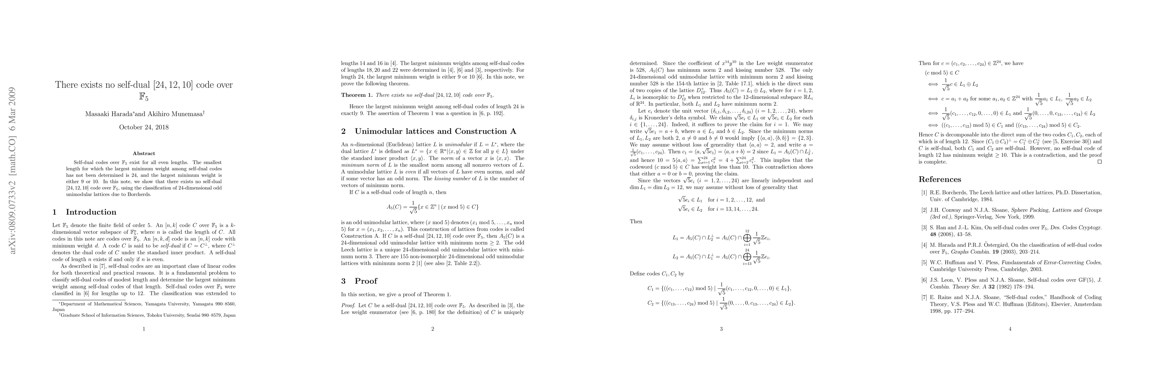 Self-dual codes over F5 exist for all even lengths. The smallest length for which the largest minimum weight among self-dual codes has not been determined is 24, and the largest minimum weight is either 9 or 10. In this note, we show that there exists no self-dual [24,12,10] code over F5, using the classification of 24-dimensional odd unimodular lattices due to Borcherds.