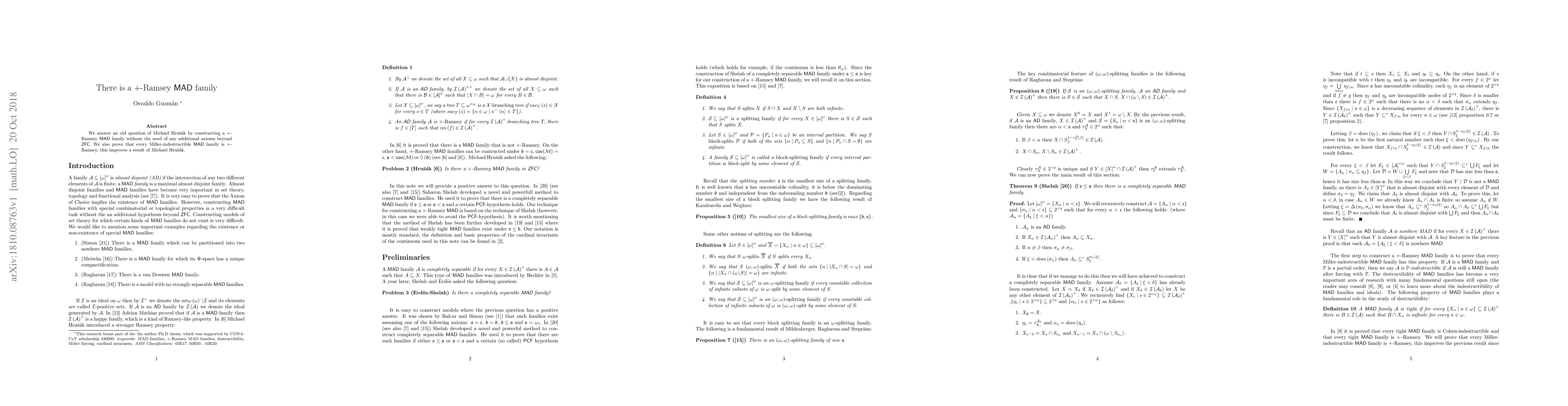 We answer an old question of Michael Hru\v{s}\'{a}k by constructing a $+$-Ramsey \textsf{MAD} family without the need of any additional axioms beyond $\mathsf{ZFC.}$ We also prove that every Miller-indestructible \textsf{MAD }family is $+$-Ramsey, this improves a result of Michael Hru\v{s}\'{a}k.