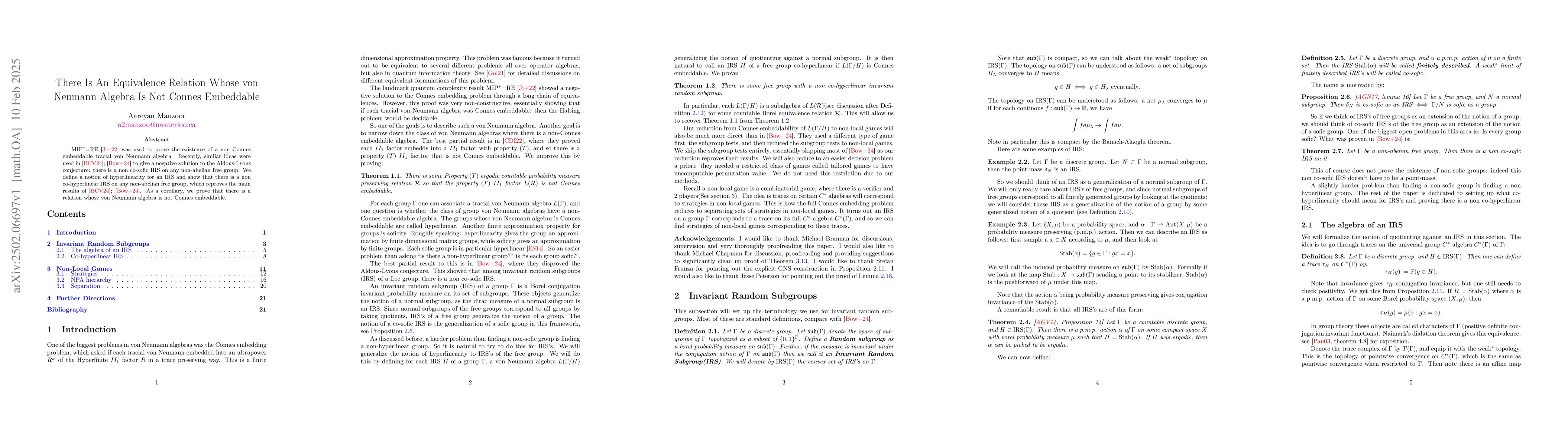 The research leverages MIP* = RE from [Ji+22] and extends it to prove the existence of a non Connes embeddable tracial von Neumann algebra. It further defines hyperlinearity for IRS and demonstrates a non co-hyperlinear IRS on non-abelian free groups, reproving results from [Bow+24, BCV24].
