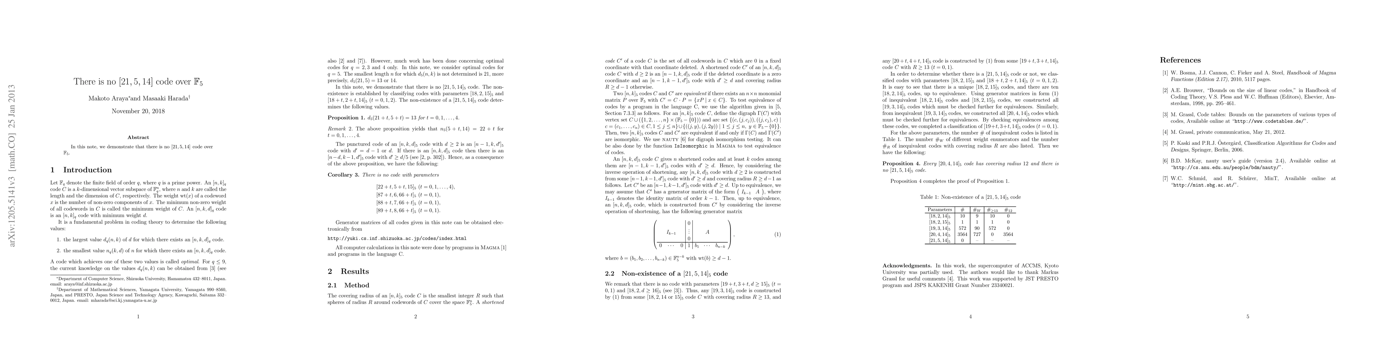 This paper proves mathematically that a [21, 5, 14] code over the finite field F5 does not exist, contributing to the understanding of error-correcting codes in coding theory.