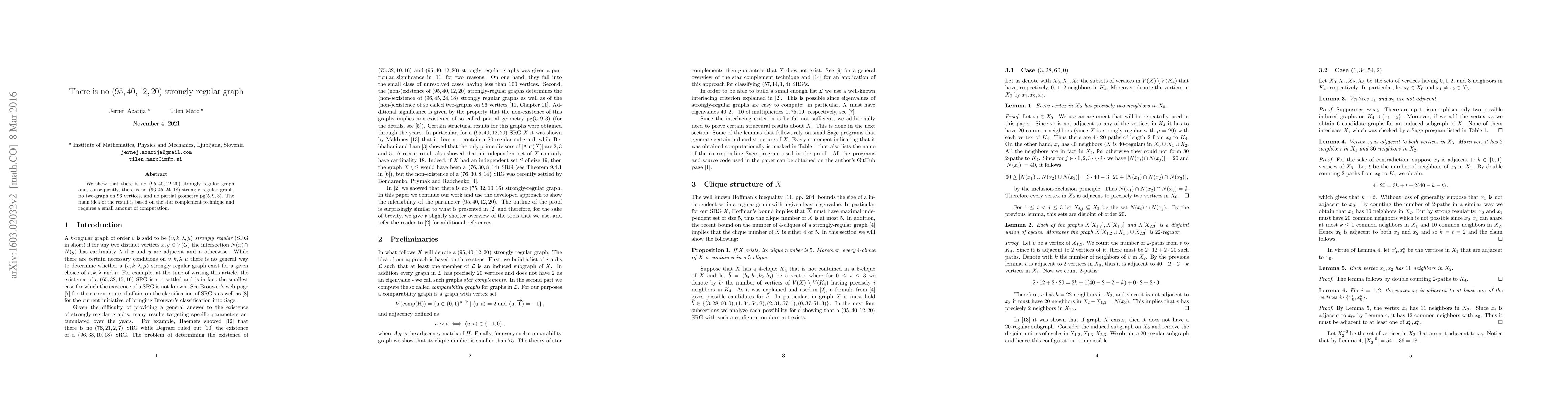 This paper demonstrates that there is no $(95,40,12,20)$ strongly regular graph using the star complement technique, which also implies the non-existence of $(96,45,24,18)$ strongly regular graphs, two-graphs on $96$ vertices, and partial geometry $\rm{pg}(5,9,3)$.
