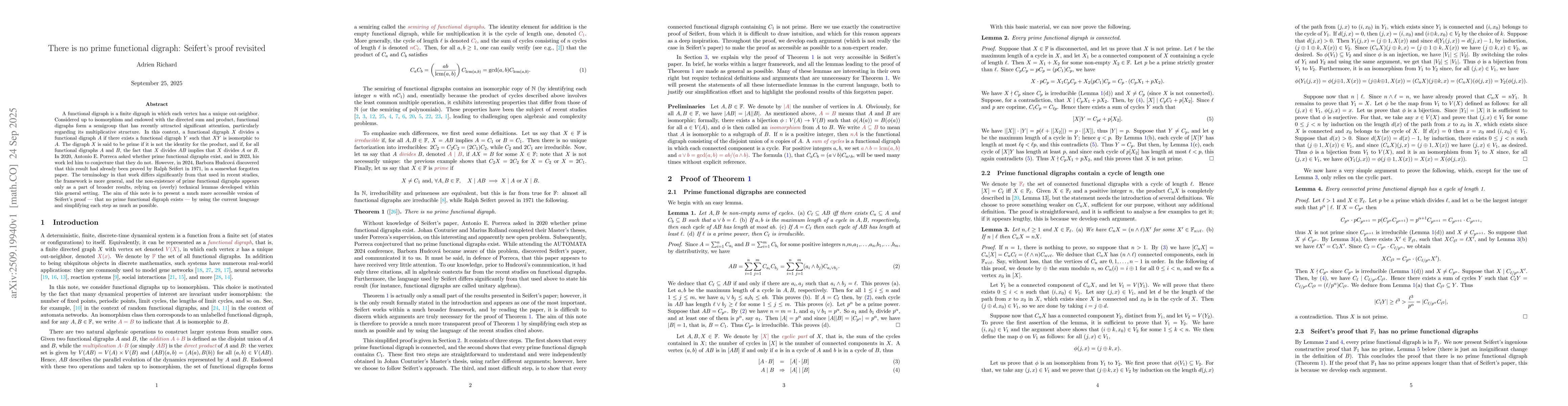 The paper provides a simplified, self-contained proof of Seifert's result, making the non-existence of prime functional digraphs more accessible to researchers in combinatorics and theoretical computer science.