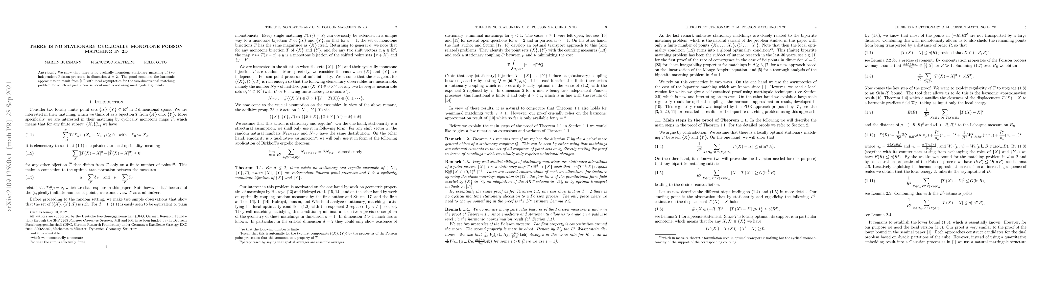 We show that there is no cyclically monotone stationary matching of two independent Poisson processes in dimension $d=2$. The proof combines the harmonic approximation result from \cite{GHO} with local asymptotics for the two-dimensional matching problem for which we give a new self-contained proof using martingale arguments.