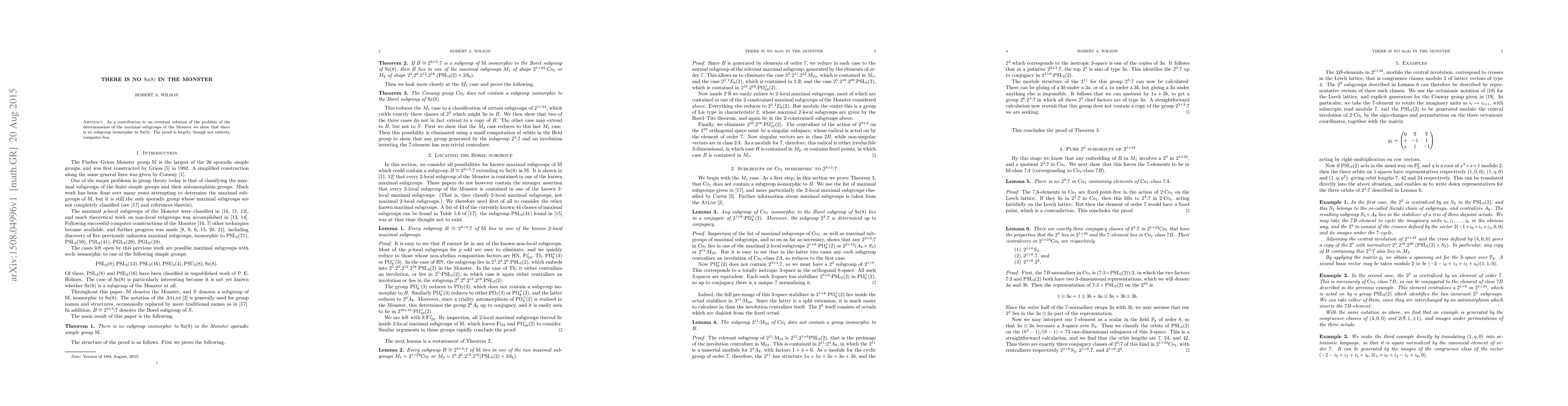 This paper demonstrates that the Monster group, a significant object in the classification of finite simple groups, does not contain a subgroup isomorphic to Sz(8), contributing to the understanding of the Monster's maximal subgroups. The proof largely avoids computational methods, relying more on theoretical arguments.