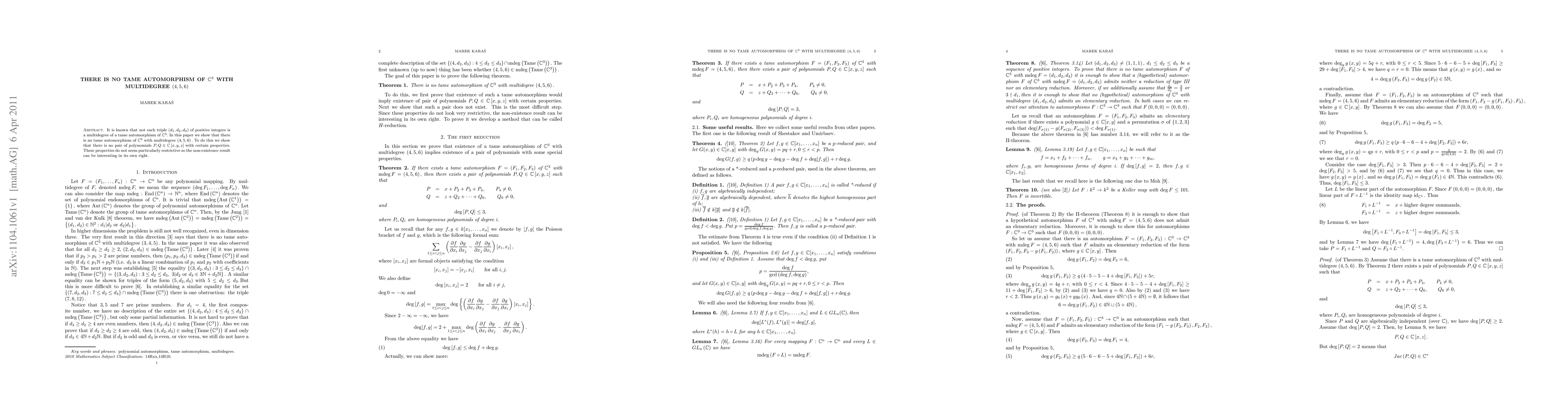 This paper demonstrates that there is no tame automorphism of \( \mathbb{C}^3 \) with multidegree (4,5,6) by proving the non-existence of a specific pair of polynomials in \( \mathbb{C}[x,y,z] \) with certain properties, highlighting a broader limitation in the multidegrees of such automorphisms.