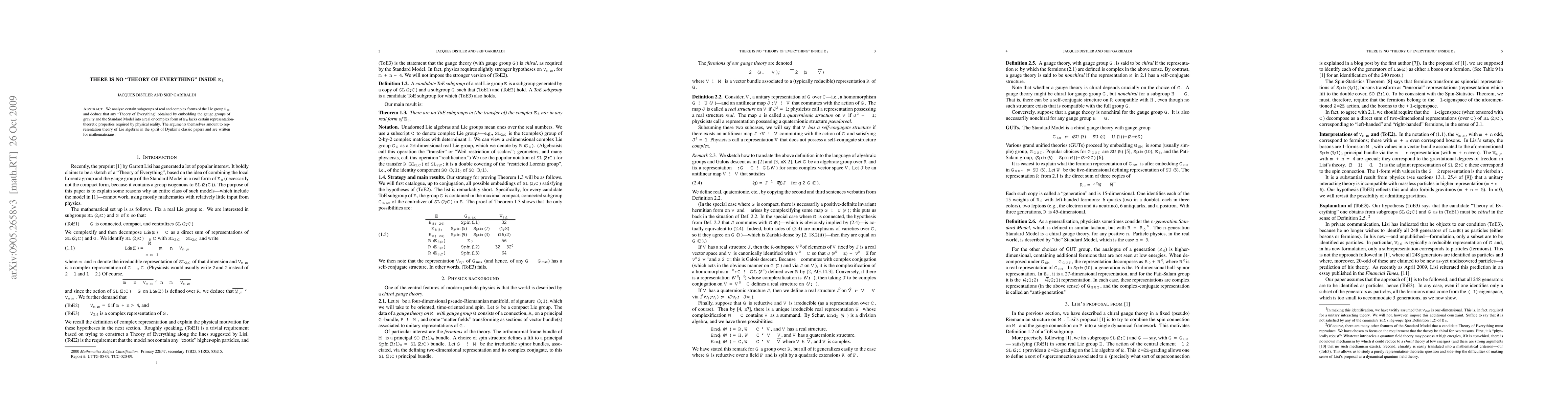 We analyze certain subgroups of real and complex forms of the Lie group E8, and deduce that any "Theory of Everything" obtained by embedding the gauge groups of gravity and the Standard Model into a real or complex form of E8 lacks certain representation-theoretic properties required by physical reality. The arguments themselves amount to representation theory of Lie algebras in the spirit of Dynkin's classic papers and are written for mathematicians.