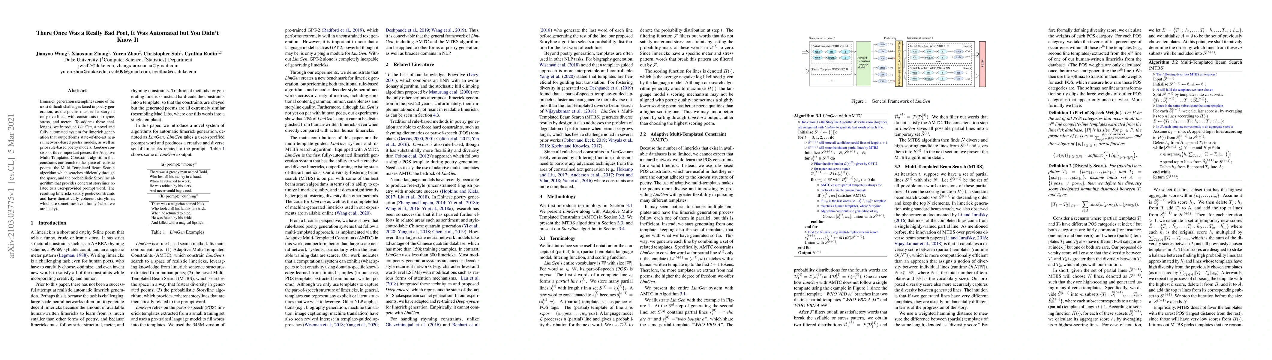 Limerick generation exemplifies some of the most difficult challenges faced in poetry generation, as the poems must tell a story in only five lines, with constraints on rhyme, stress, and meter. To address these challenges, we introduce LimGen, a novel and fully automated system for limerick generation that outperforms state-of-the-art neural network-based poetry models, as well as prior rule-based poetry models. LimGen consists of three important pieces: the Adaptive Multi-Templated Constraint algorithm that constrains our search to the space of realistic poems, the Multi-Templated Beam Search algorithm which searches efficiently through the space, and the probabilistic Storyline algorithm that provides coherent storylines related to a user-provided prompt word. The resulting limericks satisfy poetic constraints and have thematically coherent storylines, which are sometimes even funny (when we are lucky).
