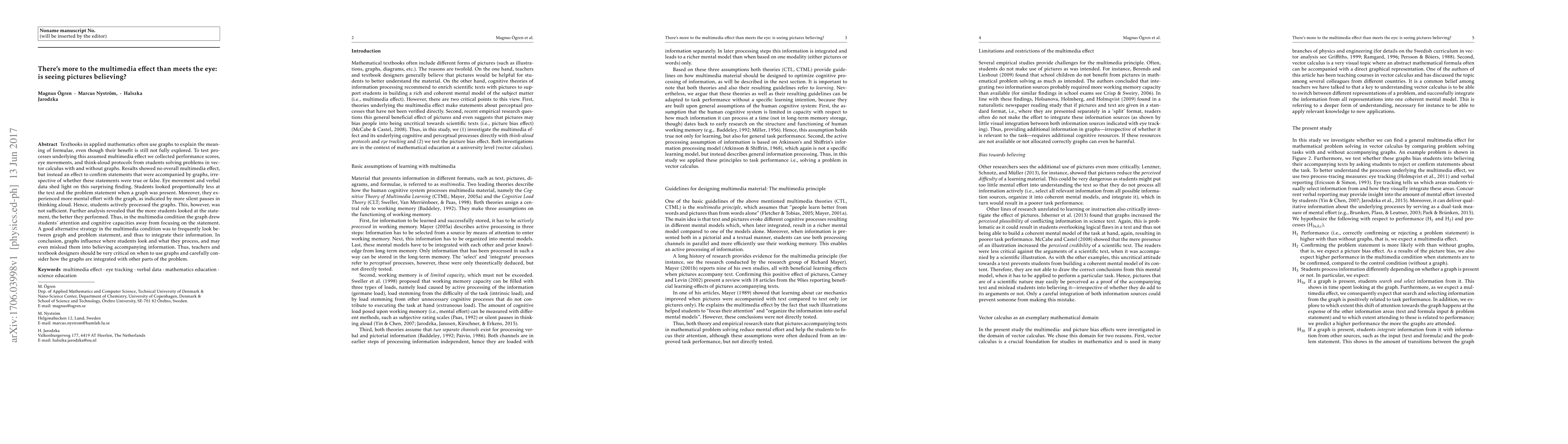 Textbooks in applied mathematics often use graphs to explain the meaning of formulae, even though their benefit is still not fully explored. To test processes underlying this assumed multimedia effect we collected performance scores, eye movements, and think-aloud protocols from students solving problems in vector calculus with and without graphs. Results showed no overall multimedia effect, but instead an effect to confirm statements that were accompanied by graphs, irrespective of whether these statements were true or false. Eye movement and verbal data shed light on this surprising finding. Students looked proportionally less at the text and the problem statement when a graph was present. Moreover, they experienced more mental effort with the graph, as indicated by more silent pauses in thinking aloud. Hence, students actively processed the graphs. This, however, was not sufficient. Further analysis revealed that the more students looked at the statement, the better they performed. Thus, in the multimedia condition the graph drew students' attention and cognitive capacities away from focusing on the statement. A good alternative strategy in the multimedia condition was to frequently look between graph and problem statement, and thus to integrate their information. In conclusion, graphs influence where students look and what they process, and may even mislead them into believing accompanying information. Thus, teachers and textbook designers should be very critical on when to use graphs and carefully consider how the graphs are integrated with other parts of the problem.