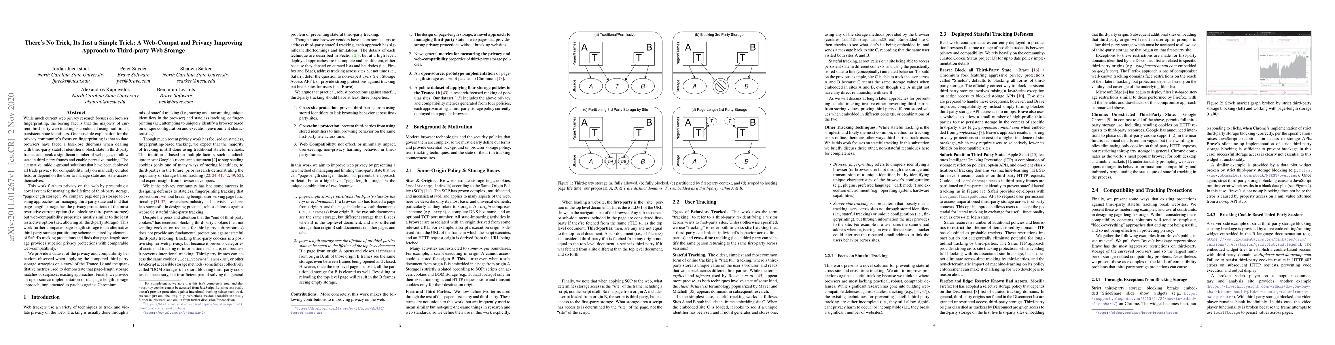 This paper proposes "page-length storage," a novel system for managing third-party web storage that offers strong privacy protections while maintaining web compatibility. Compared to existing approaches, it achieves the privacy benefits of blocking third-party storage without significantly disrupting web functionality.