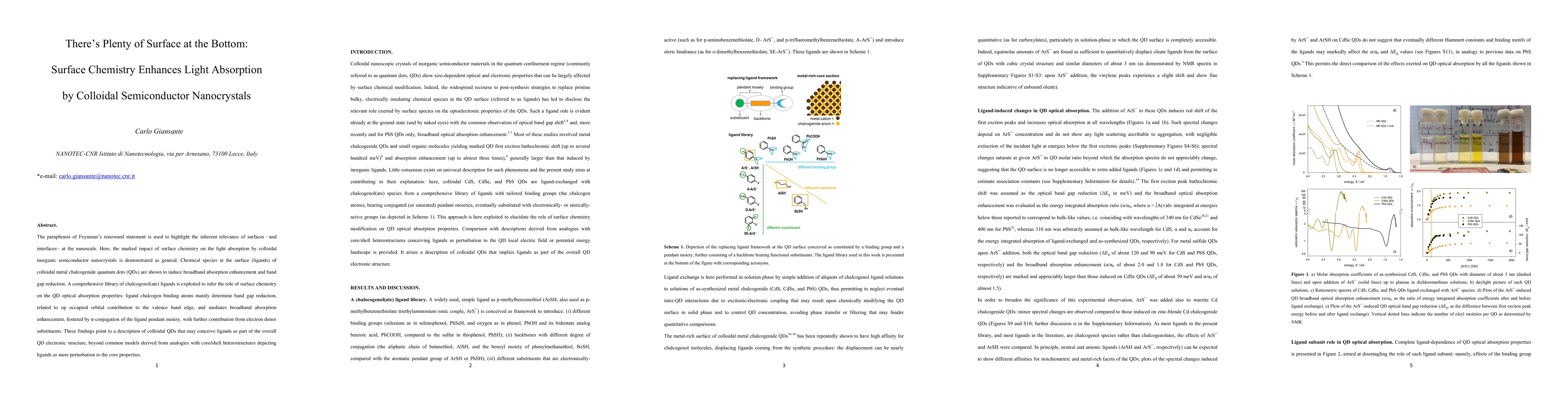 The paraphrasis of Feynman's statement is used to highlight the inherent relevance of surfaces -- and interfaces -- at the nanoscale. Here, the marked impact of the surface chemistry on the light absorption by colloidal inorganic semiconductor nanocrystals is discussed and demonstrated as general. Chemical species at the surface (ligands) of colloidal metal chalcogenide quantum dots (QDs) are shown to induce broadband absorption enhancement and band gap reduction. A comprehensive library of chalcogenol(ate) ligands is exploited to infer the role of surface chemistry on the QD optical absorption properties: ligand chalcogen binding atoms mainly determine band gap reduction, related to np occupied orbital contribution to the valence band edge, and mediates broadband absorption enhancement, fostered by the conjugation of the ligand pendant moiety, with further contribution from electron donor substituents. These findings point to a description of colloidal QDs that may conceive ligands as part of the overall QD electronic structure, beyond common models derived from analogies with core/shell heterostructures depicting ligands as mere perturbation to the core properties.