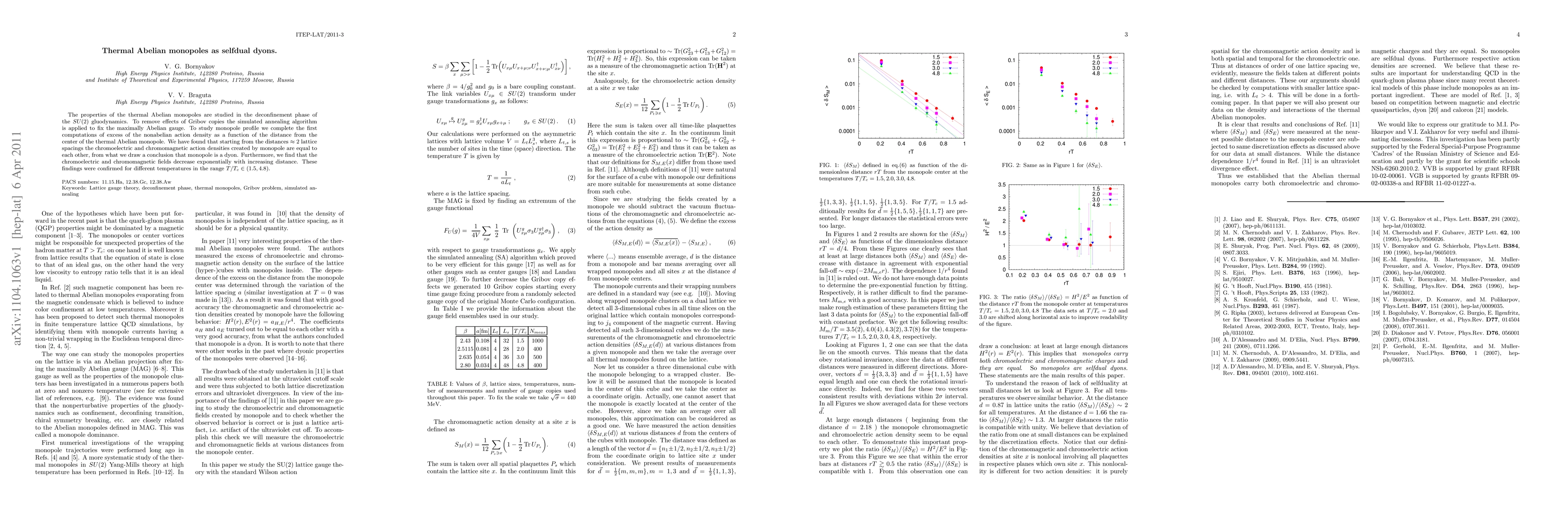 This paper investigates thermal Abelian monopoles in the deconfinement phase of SU(2) gluodynamics, revealing that monopoles behave as selfdual dyons with chromoelectric and chromomagnetic fields equalizing at distances of approximately 2 lattice spacings and both fields decreasing exponentially with distance. Results hold across a range of temperatures from 1.5 to 4.8 times the critical temperature.