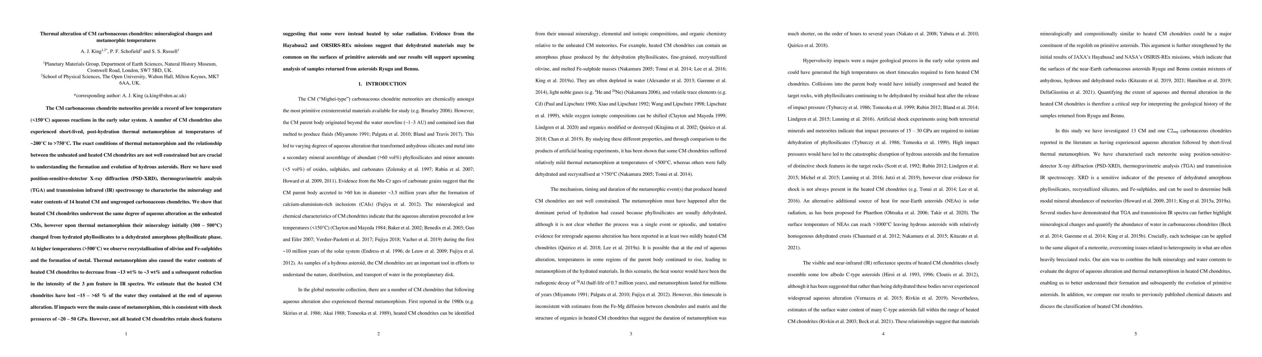 This study uses PSD-XRD, TGA, and IR spectroscopy to analyze the mineralogical changes and metamorphic temperatures in CM carbonaceous chondrites, revealing that thermal metamorphism transforms hydrated phyllosilicates into amorphous phases and induces recrystallization at higher temperatures, significantly reducing water content and supporting the hypothesis that both impacts and solar radiation may have caused metamorphism.