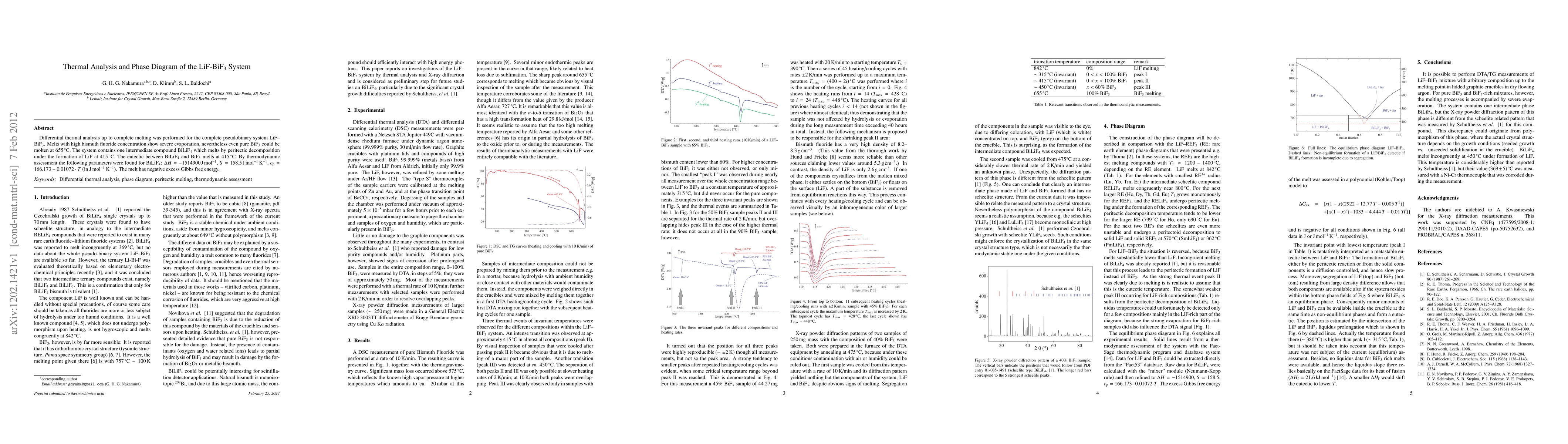 This research paper presents a thermal analysis of the LiF-BiF3 system using differential thermal analysis, revealing an intermediate compound BiLiF4 with specific thermodynamic properties. The system's phase diagram includes a peritectic decomposition and an eutectic point at 415°C, with BiF3 molten at 655°C.