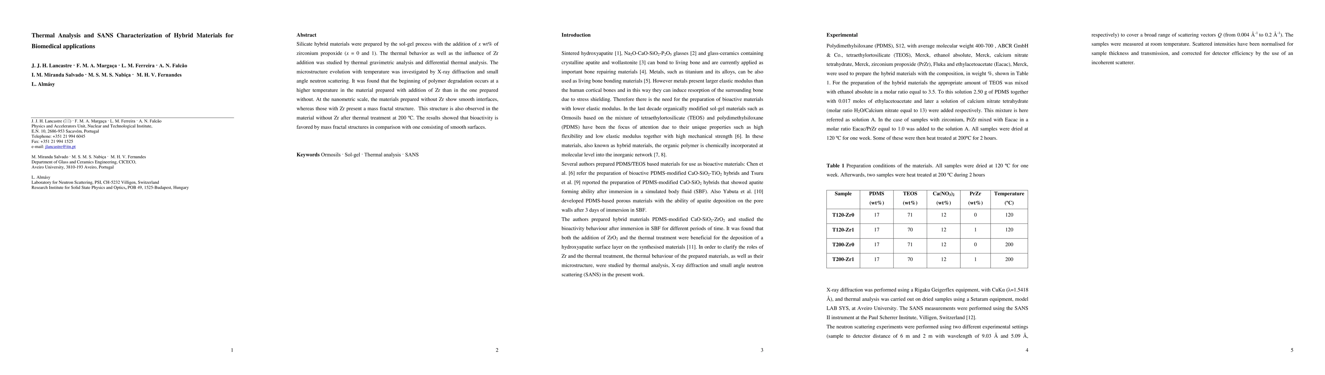 Silicate hybrid materials were prepared by the sol-gel process with the addition of x wt% of zirconium propoxide (x = 0 and 1). The thermal behavior as well as the influence of Zr addition was studied by thermal gravimetric analysis and differential thermal analysis. The microstructure evolution with temperature was investigated by X-ray diffraction and small angle neutron scattering. It was found that the beginning of polymer degradation occurs at a higher temperature in the material prepared with addition of Zr than in the one prepared without. At the nanometric scale, the materials prepared without Zr show smooth interfaces, whereas those with Zr present a mass fractal structure. This structure is also observed in the material without Zr after thermal treatment at 200 C. The results showed that bioactivity is favored by mass fractal structures in comparison with one consisting of smooth surfaces.