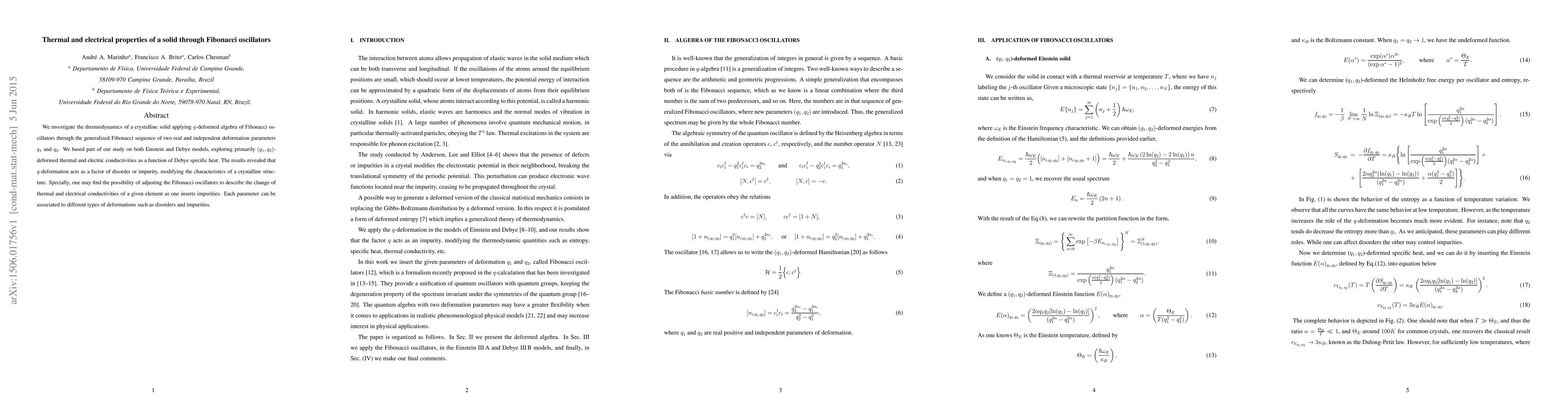 This paper explores the thermodynamics of a crystalline solid using q-deformed Fibonacci oscillators with two deformation parameters, q1 and q2. The study reveals that q-deformation alters thermal and electrical conductivities, akin to introducing disorder or impurities, potentially allowing for the adjustment of Fibonacci oscillators to describe changes in conductivity due to impurities.