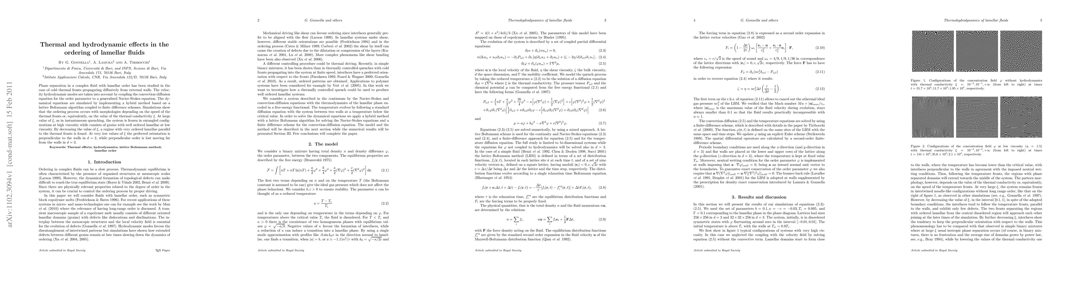 Phase separation in a complex fluid with lamellar order has been studied in the case of cold thermal fronts propagating diffusively from external walls. The velocity hydrodynamic modes are taken into account by coupling the convection-diffusion equation for the order parameter to a generalised Navier-Stokes equation. The dynamical equations are simulated by implementing a hybrid method based on a lattice Boltzmann algorithm coupled to finite difference schemes. Simulations show that the ordering process occurs with morphologies depending on the speed of the thermal fronts or, equivalently, on the value of the thermal conductivity {\xi}. At large value of {\xi}, as in instantaneous quenching, the system is frozen in entangled configurations at high viscosity while consists of grains with well ordered lamellae at low viscosity. By decreasing the value of {\xi}, a regime with very ordered lamellae parallel to the thermal fronts is found. At very low values of {\xi} the preferred orientation is perpendicular to the walls in d = 2, while perpendicular order is lost moving far from the walls in d = 3.