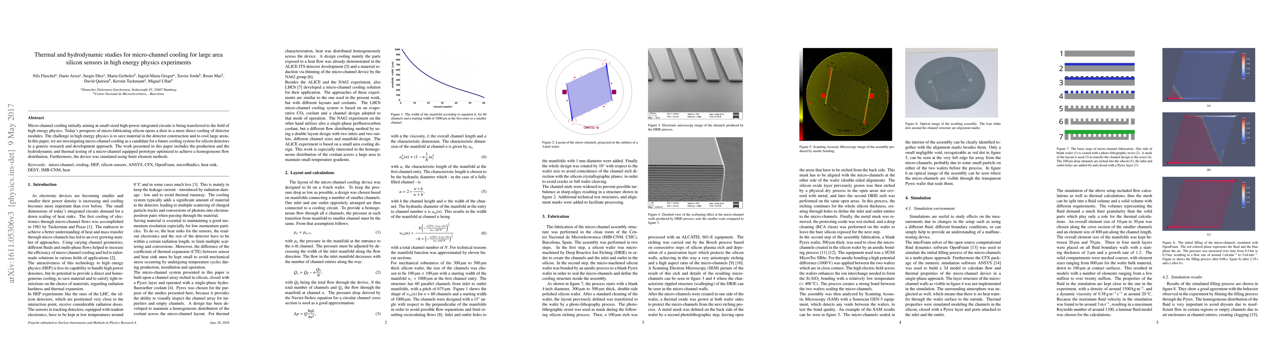 Micro-channel cooling initially aiming at small-sized high-power integrated circuits is being transferred to the field of high energy physics. Today`s prospects of micro-fabricating silicon opens a door to a more direct cooling of detector modules. The challenge in high energy physics is to save material in the detector construction and to cool large areas. In this paper, we are investigating micro-channel cooling as a candidate for a future cooling system for silicon detectors in a generic research and development approach. The work presented in this paper includes the production and the hydrodynamic and thermal testing of a micro-channel equipped prototype optimized to achieve a homogeneous flow distribution. Furthermore, the device was simulated using finite element methods.